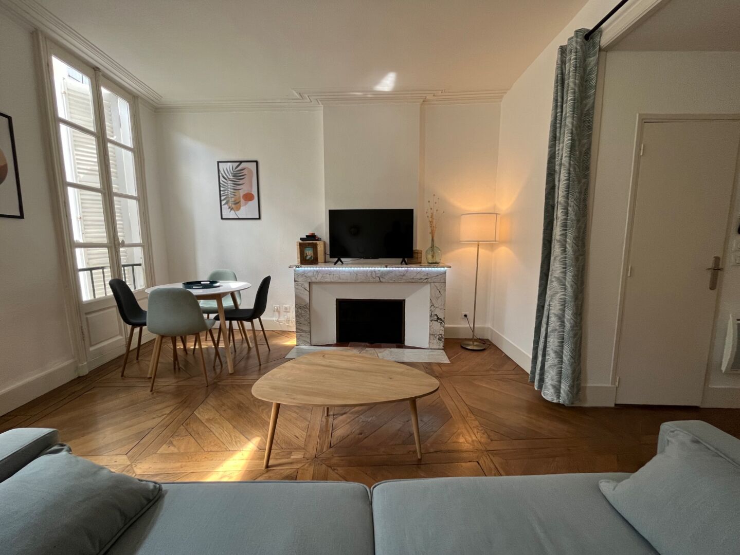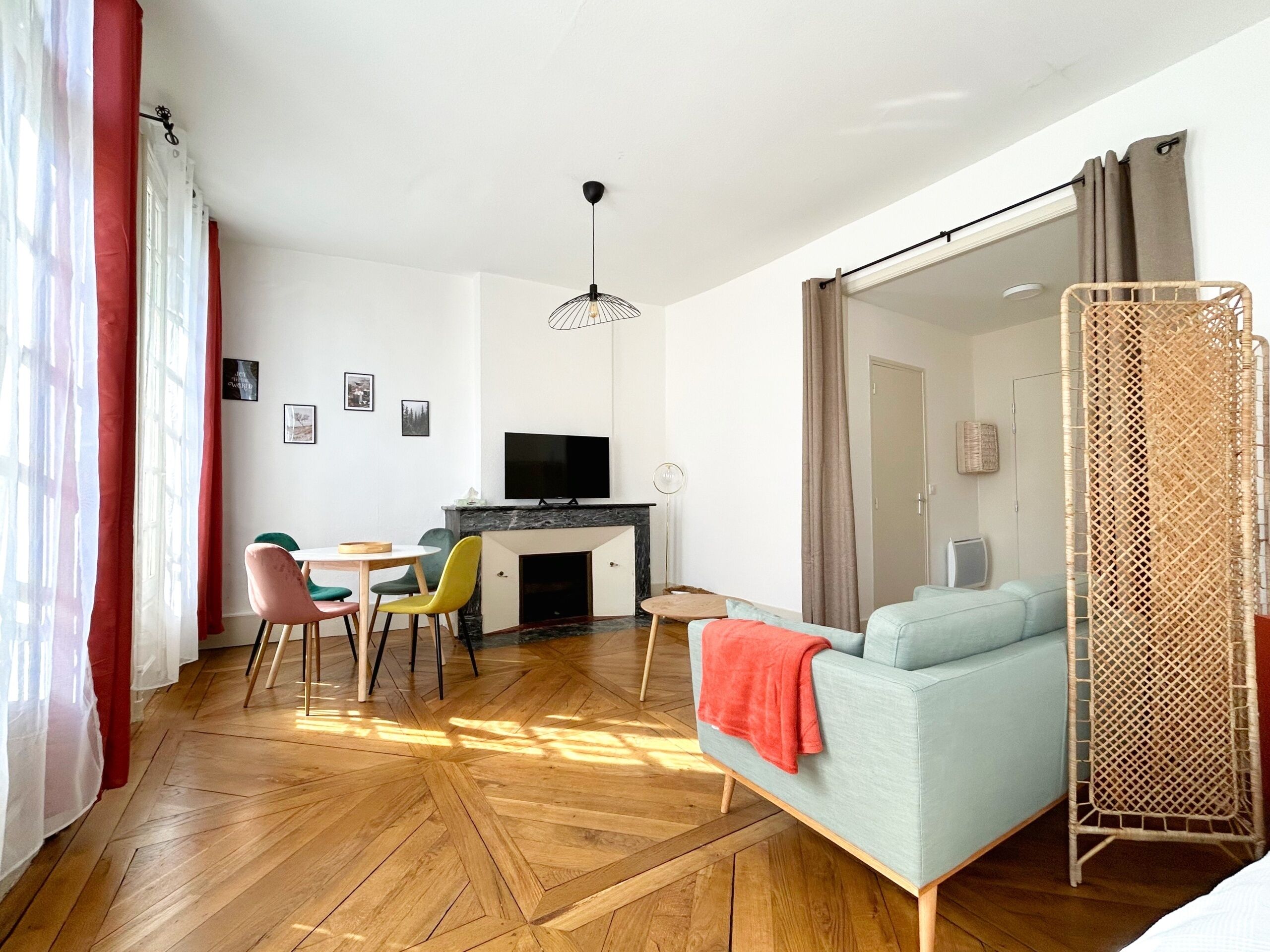 You will be greeted by a large living room of 28m2 in which you will find a superb Versailles parquet floor, a marble fireplace and many mouldings. The living area has a sofa with coffee table, a smart TV and a fibre livebox. The dining area will offer you a table and four chairs and the sleeping area a chest of drawers and a 160 bed with Emma mattress.