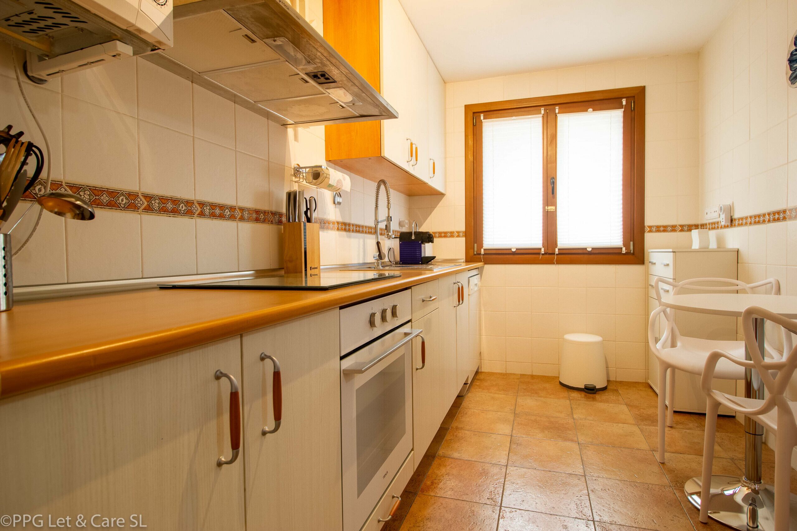 It has 2 bedrooms, a living area with lounge and dining room, flat screen TV and a fully equipped kitchen with dishwasher, ovens, induction, fridge-freezer, washing machine, etc.