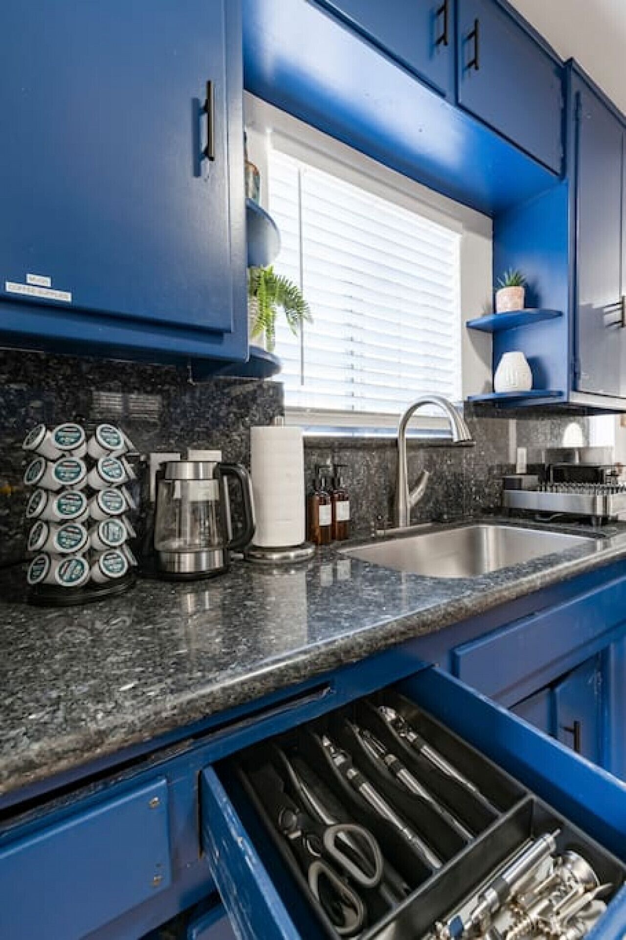 Imagine Mid Century Modern meets Jungalow vibes. The living room has large windows that bring in lots of light during the day. The kitchen has everything you need to chef it up. There are two TV’s in the condo. One in a guest room and the other in the living room.