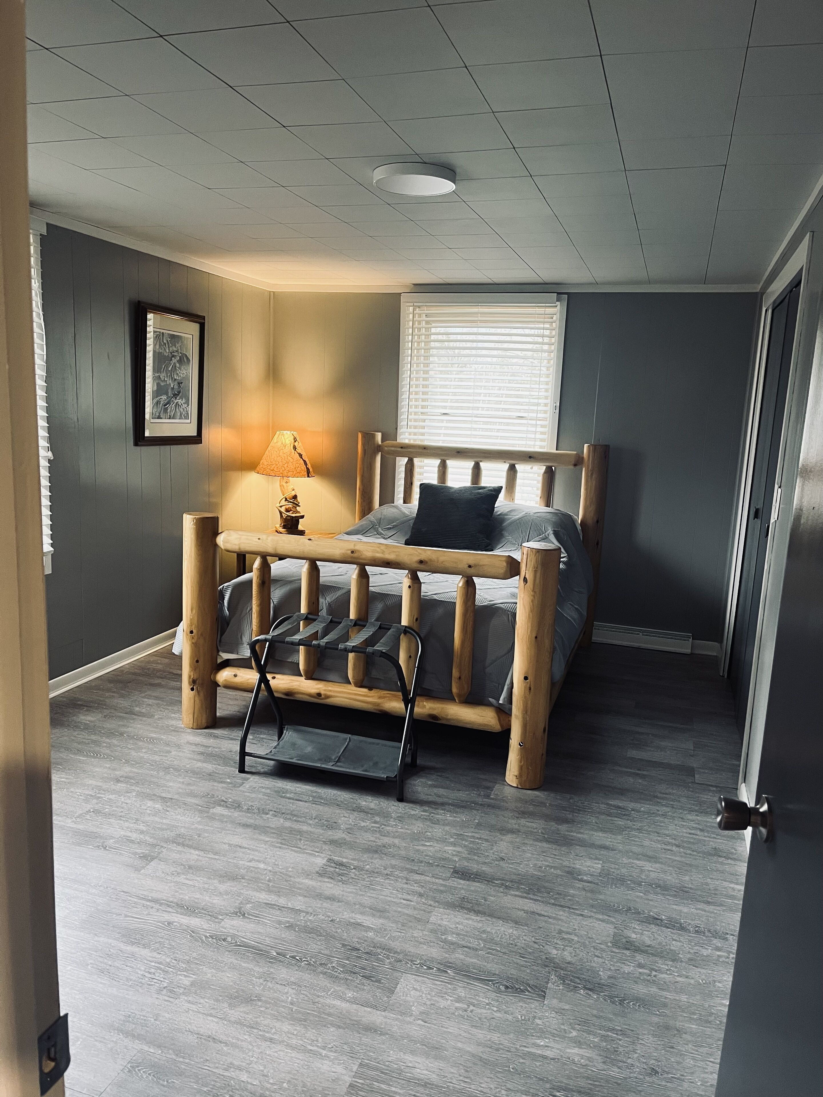 Near Lake Cecilia township park this fabulous cabin offers guests a cozy retreat with 1 queen bed in the bedroom and a living room with 3 twin beds. The couch is made of 2 twin xl beds that can be joined together to form a king size bed. There is also a trifold foam twin mattress that can be used for less discerning guests. Enjoy the AC and heating during your stay, and freshen up in the bathroom with a luxury rain shower head. Make yourself at home in this enjoyable space and experience what Baldwin has to offer with a stay at our vintage vertical log cabin. Take a short walk across the street to the township park lake access for swimming or paddle boarding. This cabin has a large projector screen in the living room. Internet access will be available to guests starting in April 2025. Cell reception has significantly improved since the new tower has been installed.