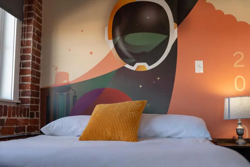 Enjoy an out-of-this-world stay in this cozy, cosmic, full-sized apartment! Custom artwork by Manchester’s own Dave Hady paired with punchy colors and celestial accents rockets this unit to the next level of design, while amenities like the equipped kitchenette, full bathroom, and comfortable bedding ensure that you’ll wake up every day feeling like a star!
