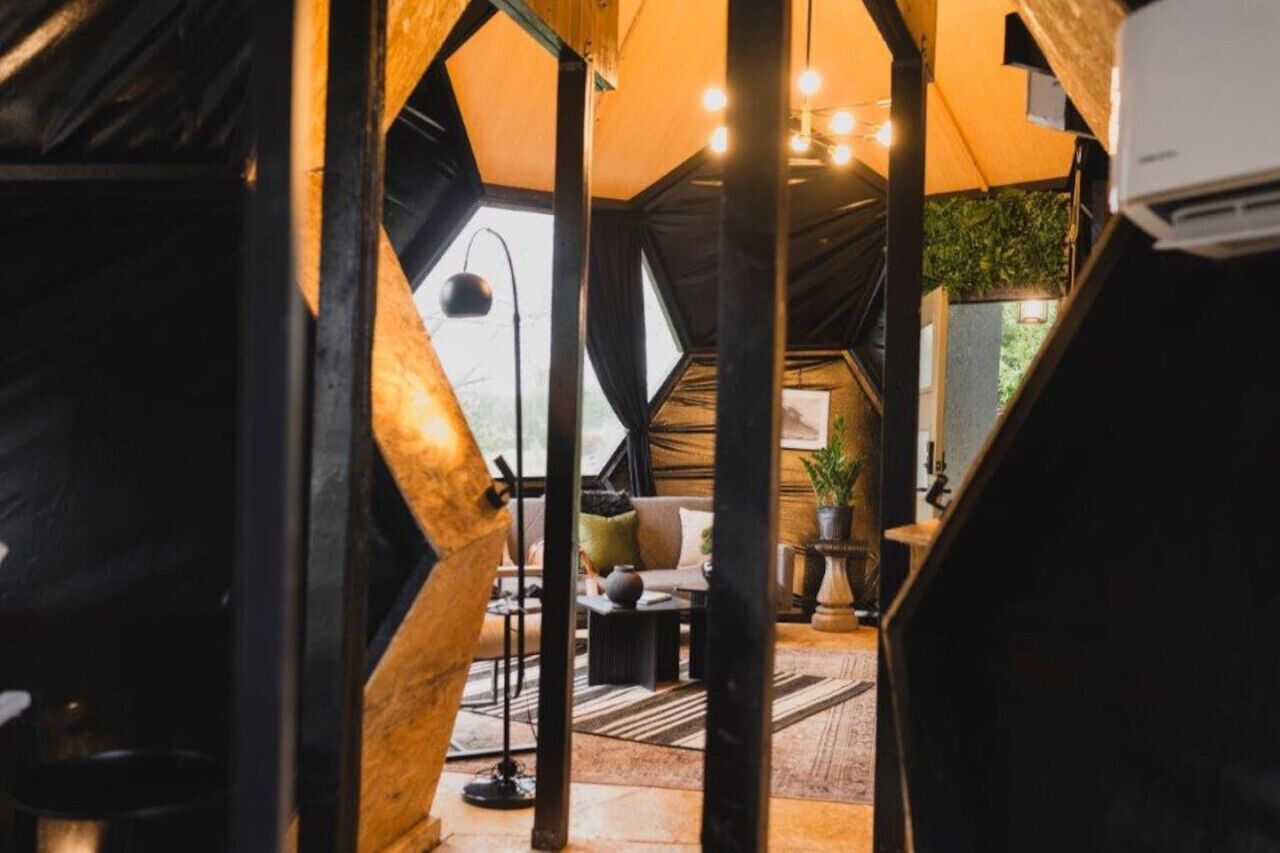 Within the confines of the dome, a snug bedroom awaits, offering a secluded retreat complete with a plush king-sized bed adorned in luxurious linens. Expansive hexagonal windows view the lovely landscape, while a lively green wall infuses the space with a hint of nature.