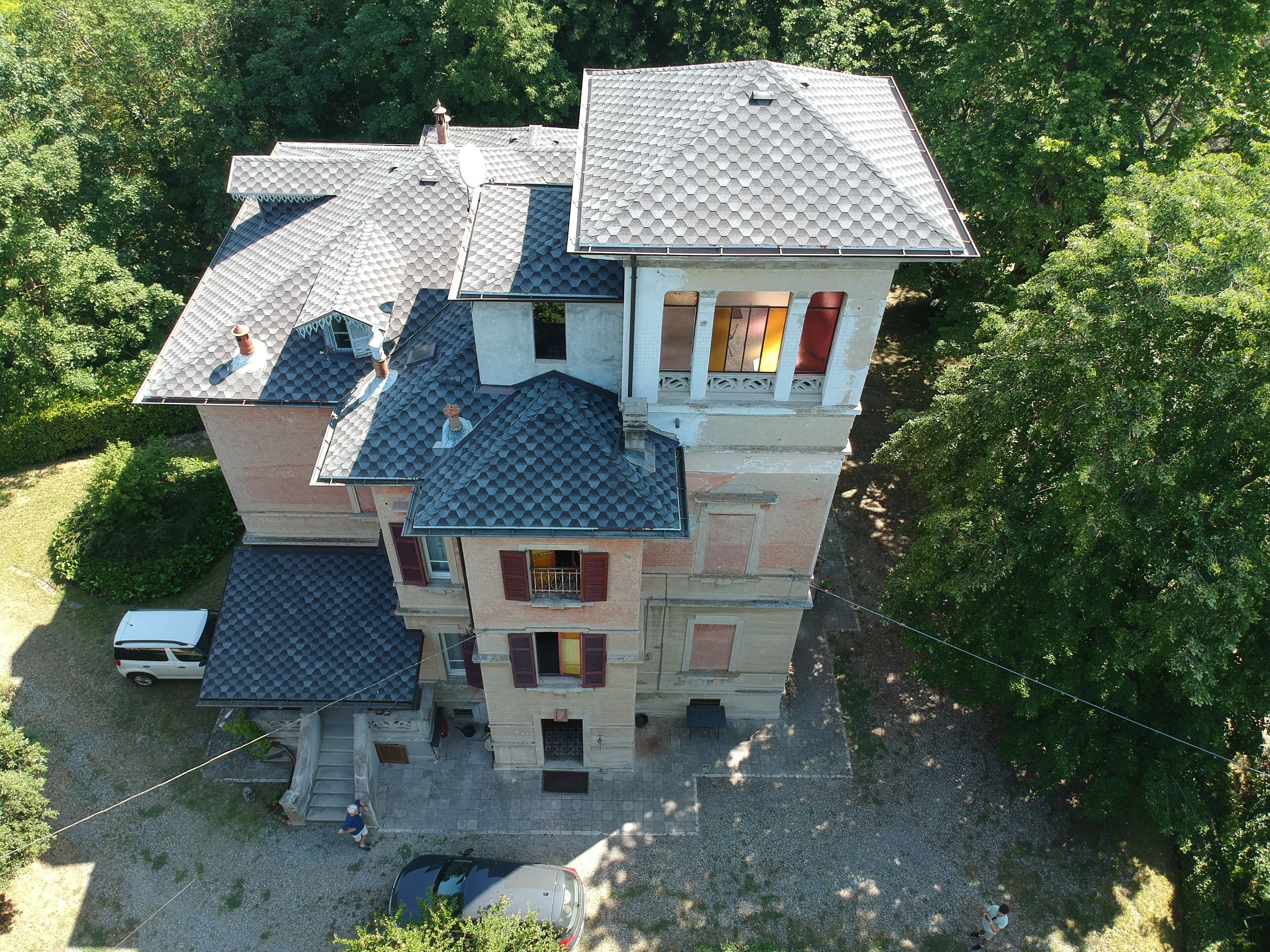 Art Nouveau Villa from the 1920s, on 5 levels (semi-basement, mezzanine, first floor, attic, turret), with antique furniture, stained glass windows, florally decorated tiles and frescoes. In the large cellar / tavern there is an old bread oven still working. The house is surrounded by a large garden and a park of pines and oaks.