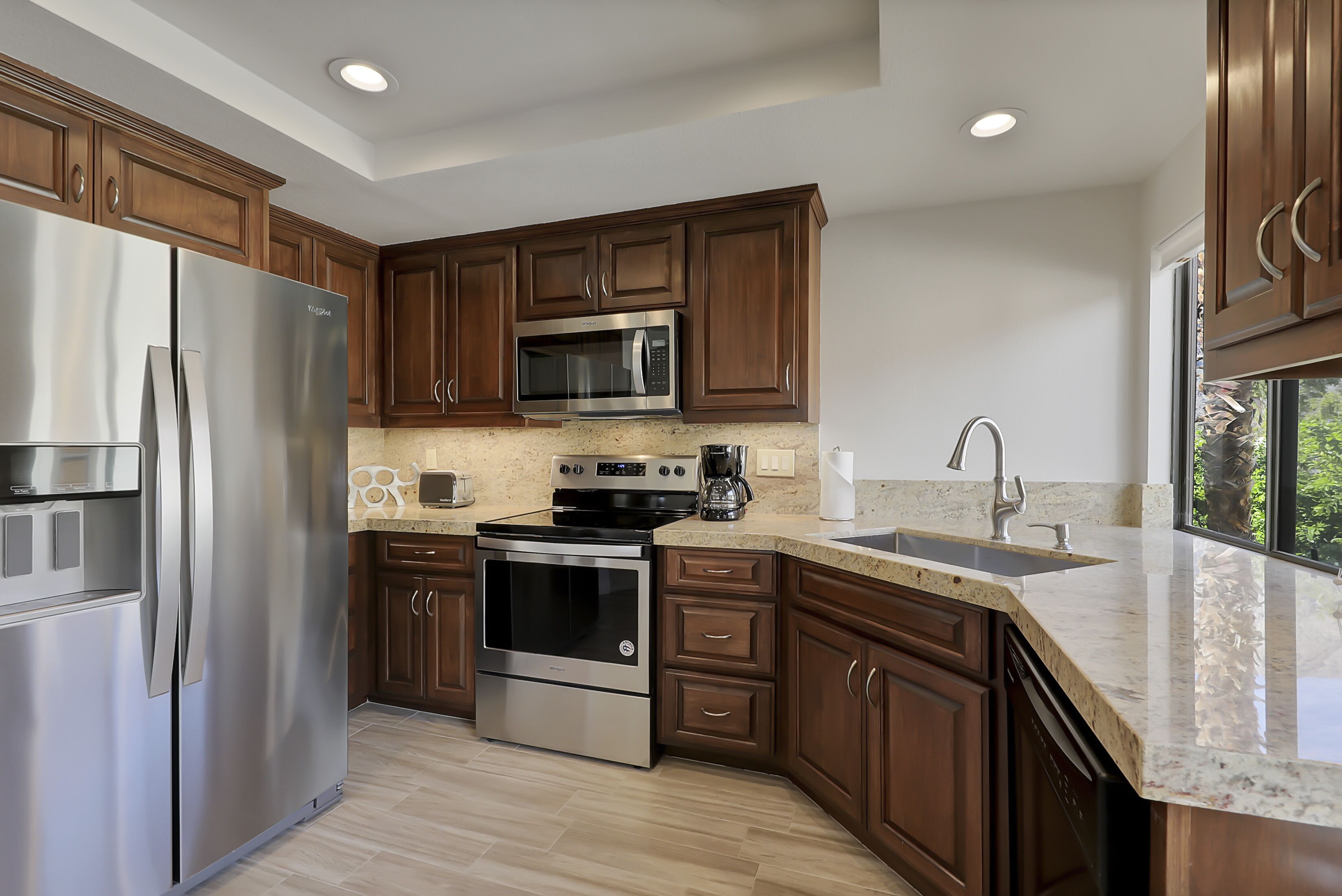 Condo located in PGA West/Arnold Palmer gate with eastern views of the Palmer Lake from living room balcony. Fruit trees off the walk way, greet you before entering the front door. 1525 Sq Ft C Floor Plan with 3 bedrooms 1 3/4 bathrooms. Primary and second bedrooms offer king beds, with set of twins in the 3rd. Wall mounted Tv's in all bedrooms. Living room has a fireplace with mounted TV over the hearth. Kitchen has updated custom cabinets, granite countertops, stainless steel appliances. Tiled kitchen and bathrooms with carpet throughout the rest of this home. The 2 car attached garage has new drywall and a new insulated door.