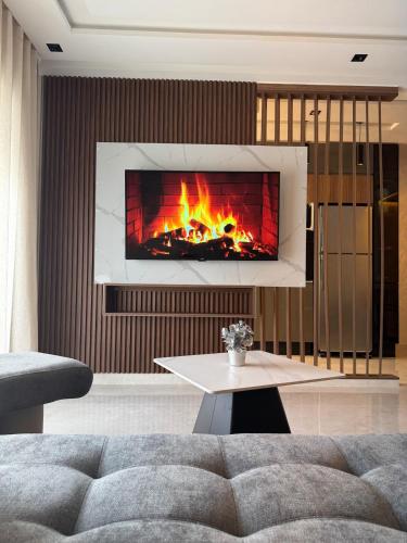 This apartment features an elegant living room, a fully equipped kitchen, two bedrooms, and two modern bathrooms.