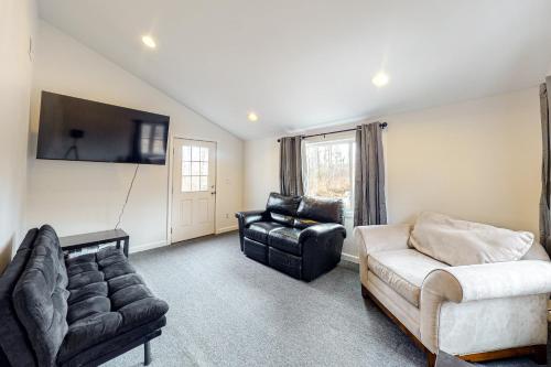 Welcome to The Barnhaus. This brand-new construction custom-built home was finished in June 2022. Built specifically to be a vacation home, we have thought of everything! This cabin has all solid wood furnishings, real leather upholstery, 1080p 40 inch TV's in each bedroom and great water pressure! Perched up on a hill in a quiet neighborhood, our home is secluded & quiet yet less than 5 min. from Shawnee Peak and Moose Pond. We cut no corners while building this house and hope to have you soon!