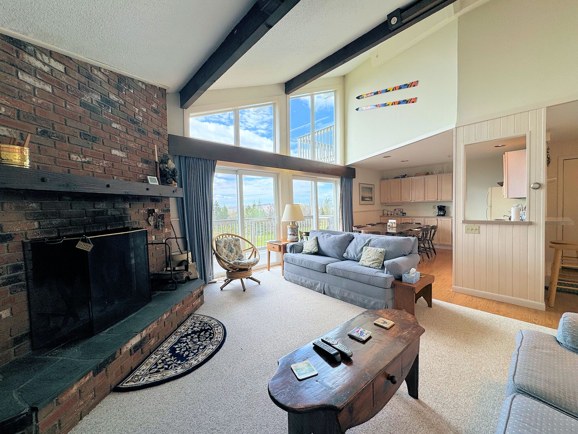 INDOOR LIVING: Flat-screen cable TV, DVD player, wood-burning fireplace, 8-person dining table, open floor plan, vaulted ceilings, wall-to-wall windows