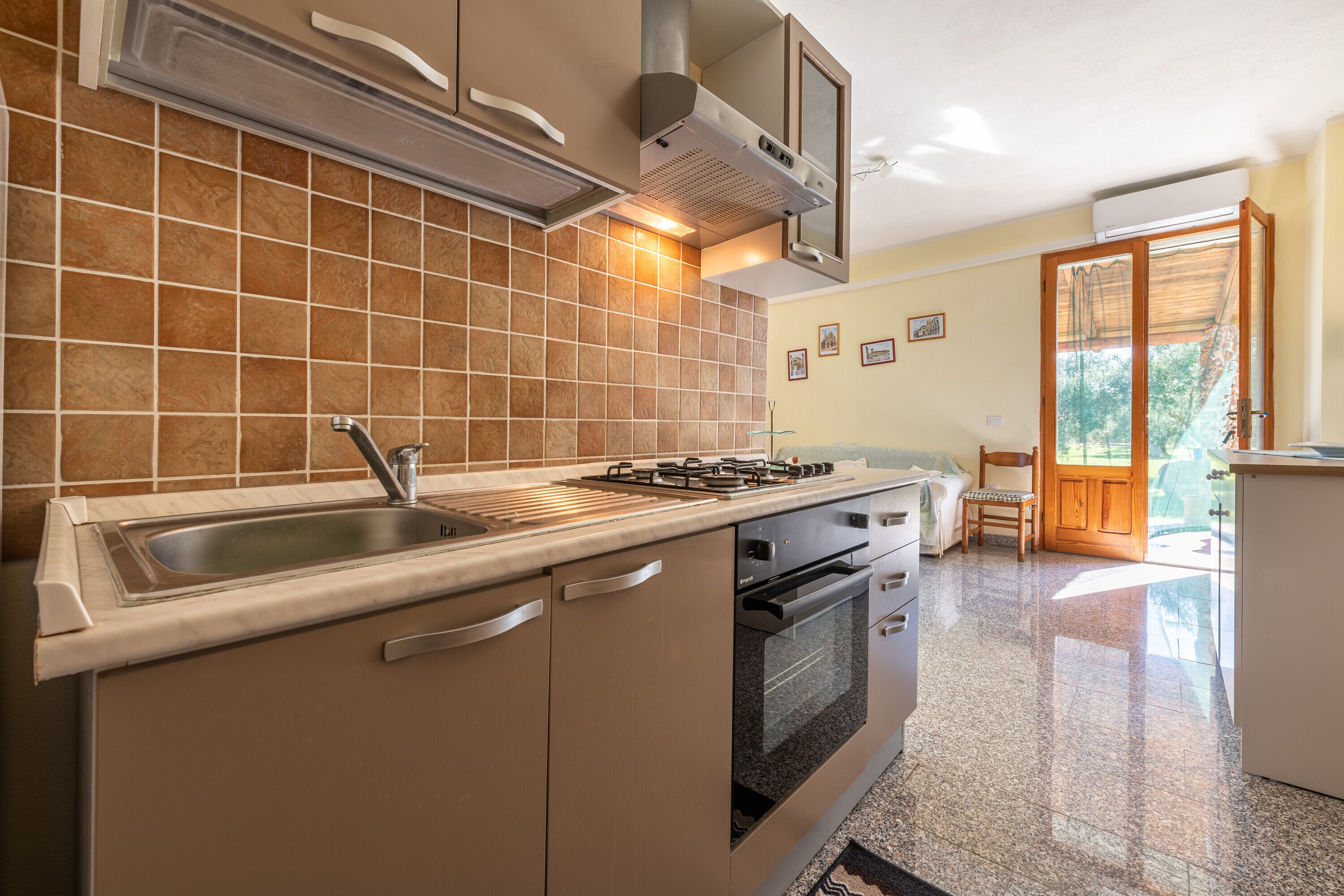 Apartment with garden on the ground floor. Composed of living area where there are kitchenette, equipped with refrigerator, oven, stove and sink and dining room with table, chairs, television, mobile sideboard, a double sofa bed. The living area and the master bedroom are CLIMATE. Two bedrooms, one double and one bedroom equipped with three beds. Bathroom with sanitary, shower and washing machine. Arrangement of ironing board and iron and hairdryer. Outdoor barbecue and shared swings. Independent outdoor shower for each apartment. Veranda with sitting area, table and chairs for outdoor dining. The apartment is furnished with Sardinian style furniture, well lit and very welcoming. IUN: P5076
