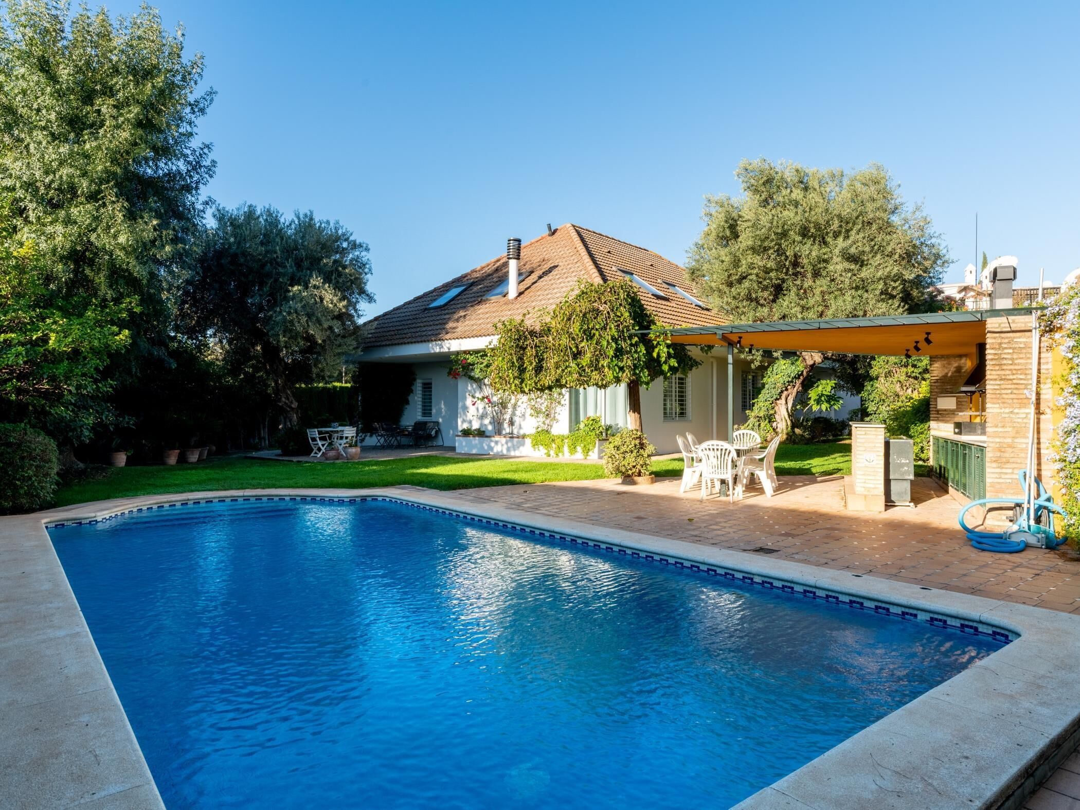 Our house 'Colina Blanca', is perfect for families or large groups who want to enjoy Seville, but with the comfort of having enough space during their stay. The house has 4 bedrooms, 3 bathrooms, a large living room, office, fully equipped kitchen, game room for children, library, garden with a pool and parking for 2 cars. The house is equipped with wifi, central heating and air conditioning.