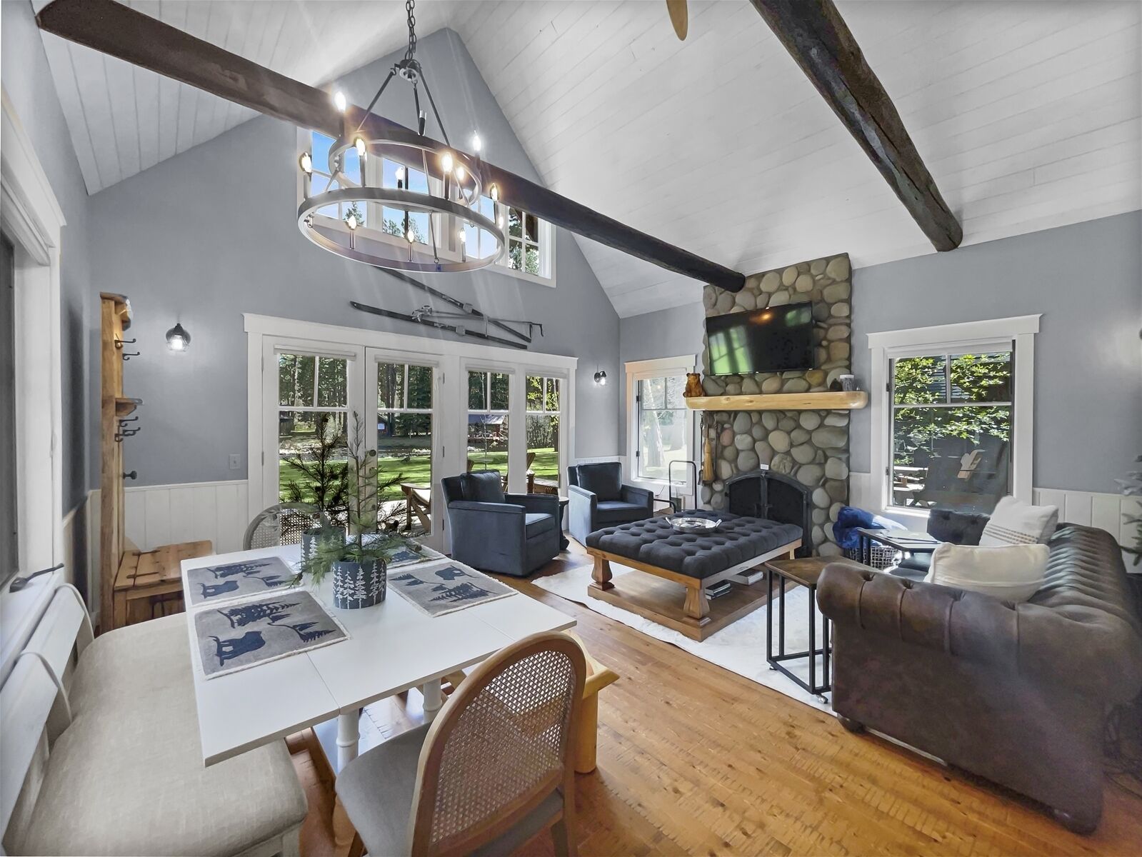 Step onto the back porch to enjoy breathtaking river views and vibrant foliage, or gather in the inviting living area where a plush sofa and armchairs surround a stone fireplace—perfect for cozy evenings with a book, a movie, or quality time with friends and family.