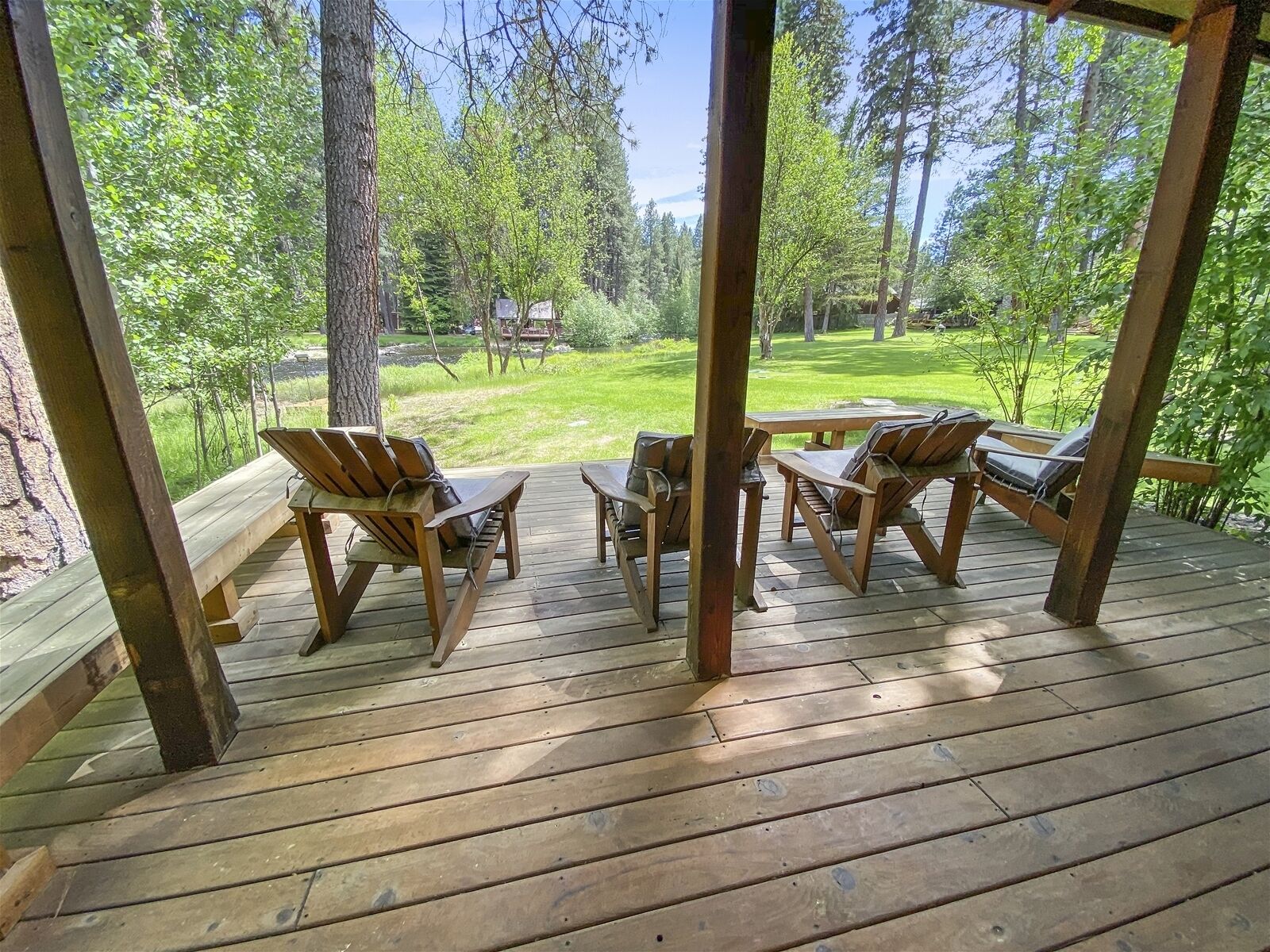 Features include a stone fireplace, CD player with a small CD collection, and a fully equipped kitchen. End the perfect day with a nice glass of wine on our deck that overlooks a lush lawn area, Ponderosa pines, and of course, an incredible view of the river.