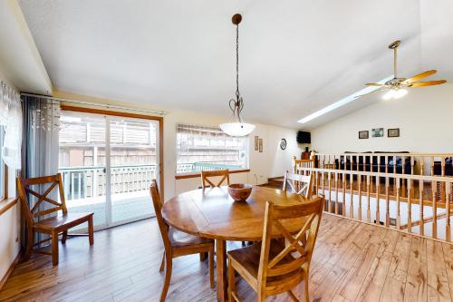 Step inside this three-story vacation rental with a treehouse feel and discover a sunlit, main-level great room with soaring ceilings, skylights, and comfortable furnishings for easy entertaining. Prepare everything from your morning coffee to full-course dinners in the well-equipped island kitchen complete with an array of stainless steel appliances. Dine together at the nearby table or break out a few of the provided board games on rainy days. This open space continues with an inviting living area with cozy seating, a large TV, DVD player and media library, and a turntable ready to spin your favorite vinyl records or sync with your Bluetooth device to fill your home with your favorite tunes.