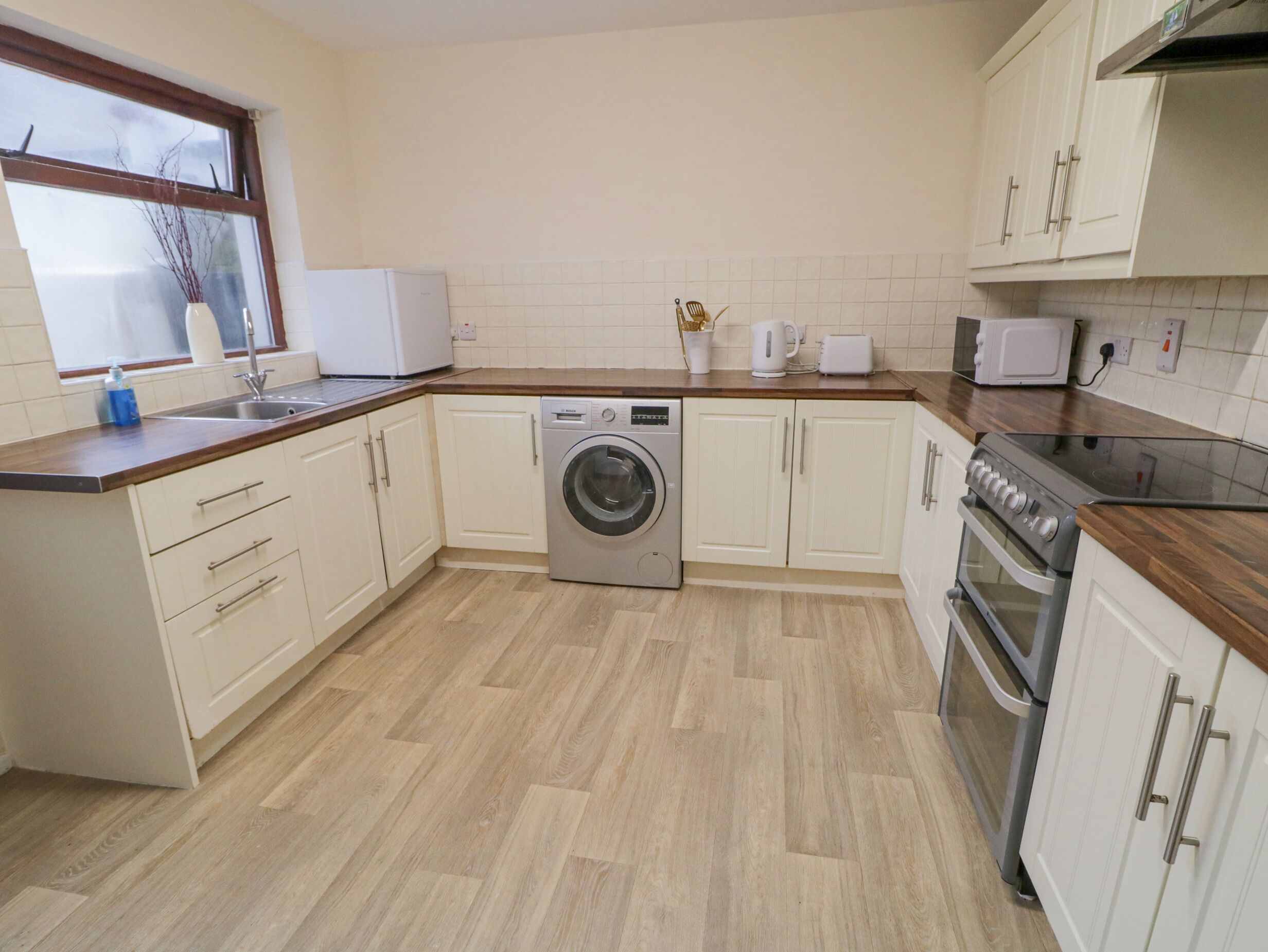 - Fridge, freezer, hob, oven, toaster, kettle, dishwasher, microwave