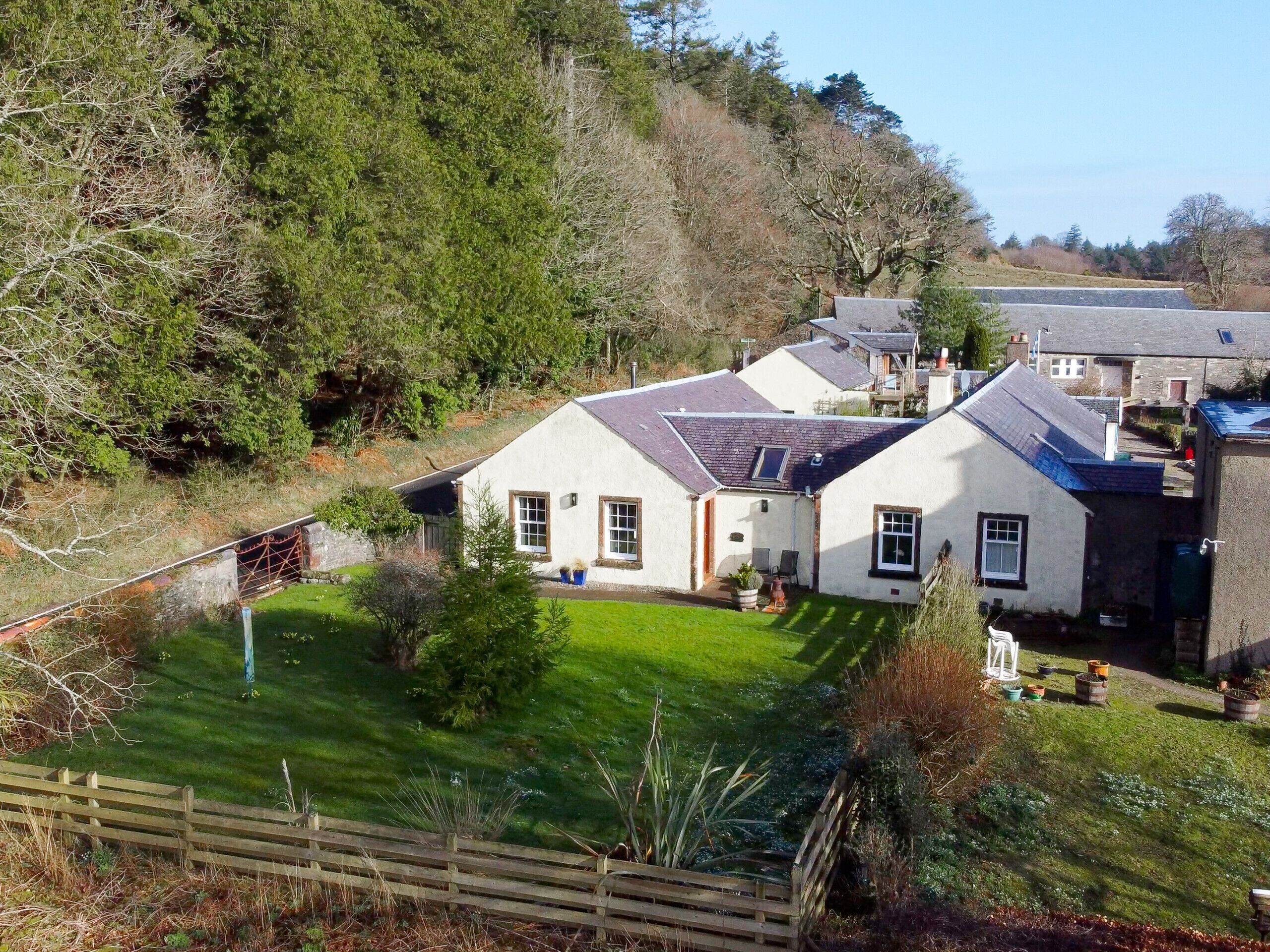 Outside there is a lovely lawned garden which benefits from direct sunshine throughout most of the day. It is a fine place to sit and relax, with towering fir trees to one side, a sneaky glimpse of Ailsa Craig to the other, and fields and the farm before you.