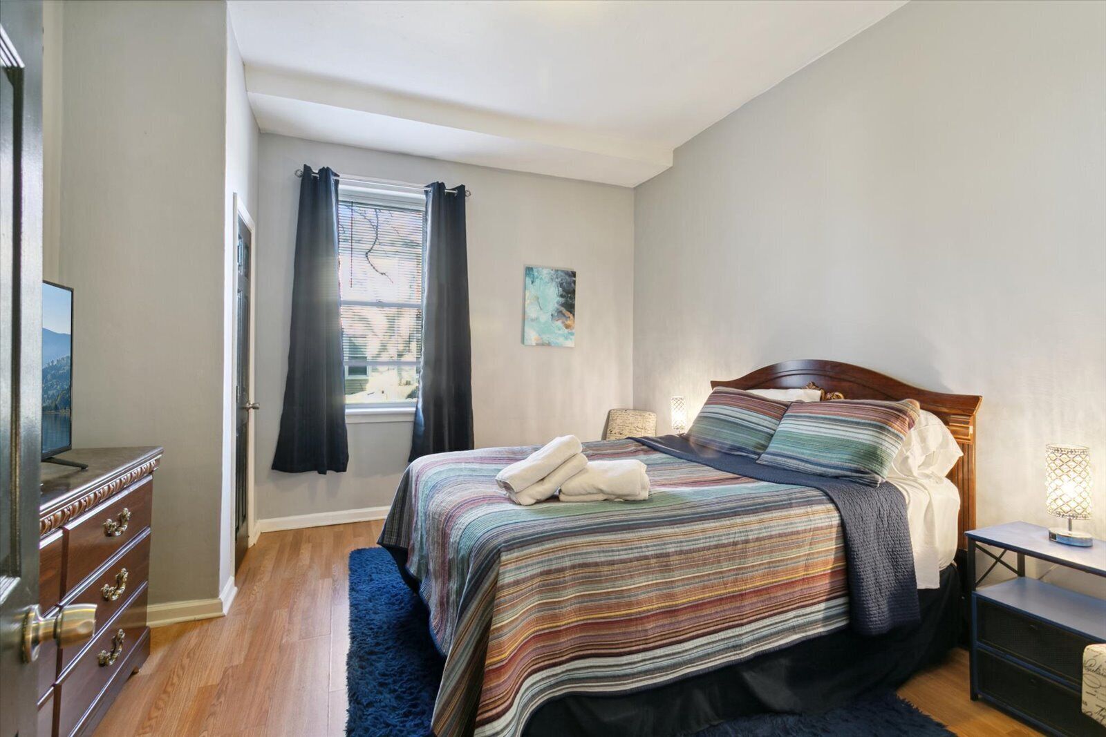 This property is a 3 bedroom, 1 bathroom unit that is located on the 2nd floor of a duplex. The large bedroom is the largest room in the house and has a queen-size bed, chest of drawers, night tables, sitting area and 43 smart TV. The medium bedroom has a full-size bed, night table, chair, chest of drawers, and 43 smart TV. The third bedroom is furnished as an office, but can be converted into a twin-sized bedroom upon request. The living room has plenty of seating and a 55 smart TV. The kitchen is fully stocked with basic appliances, pots, pans, dishes, cutlery and other basic kitchen items. All bedding and towels are provided. You will only have private access to your bedroom, and off limits of the other bedroom rented, but the rest of the home is shared with the other guest.