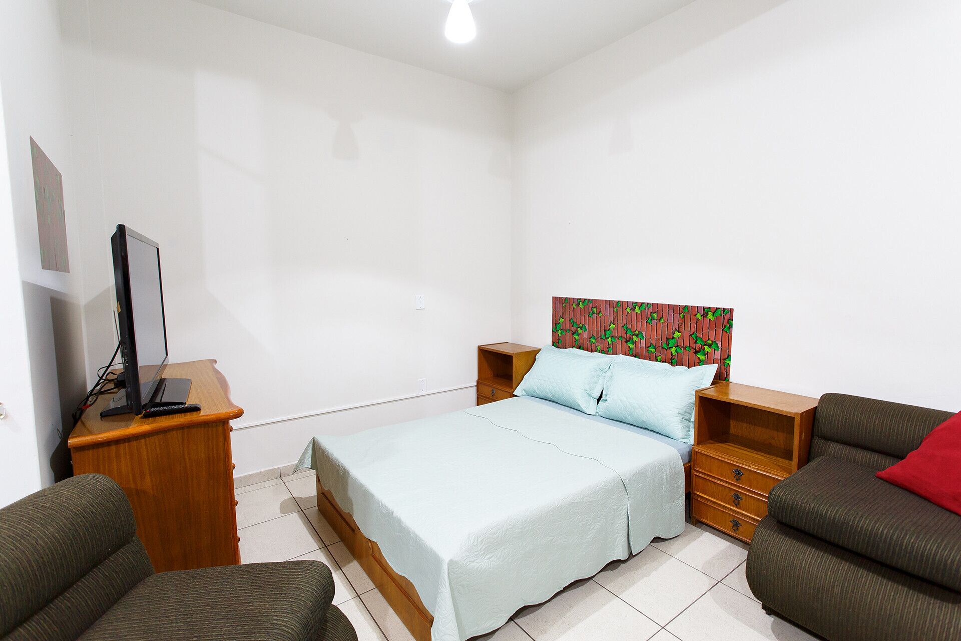 King bed room, family atmosphere great location, has TV and internet, a bathroom available only to the renter being private. Allowing pets can circulate in the environment only with authorization, smokers are not allowed, you can use WiFi at will, we have microwaves if necessary, washing machine and dryer only a fee of 15 reais to use. Super family atmosphere not allowed music in Son Alto.
