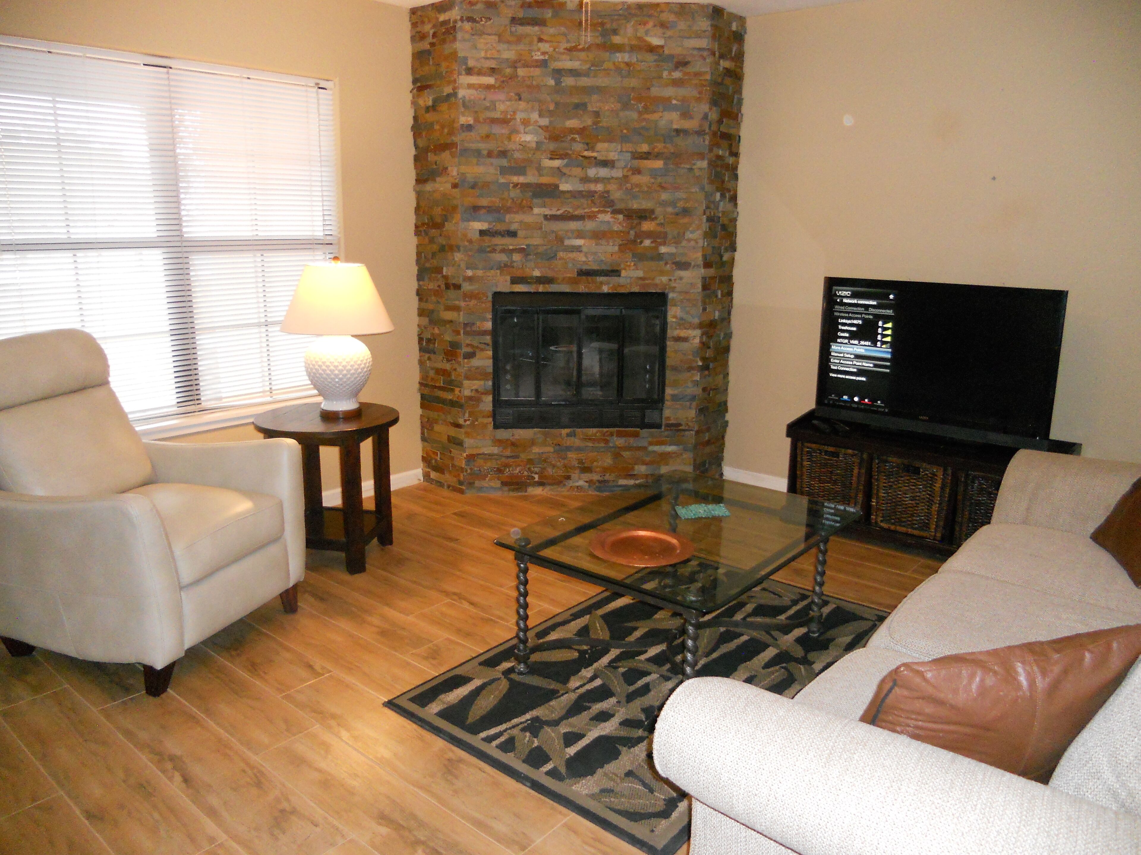 A living room, a fireplace, air conditioning, and a ceiling fan are featured at this 2-bedroom, 2-bathroom rental. Connect to the free WiFi, or get cozy in front of the TV. Prepare a home-cooked meal in the kitchen, complete with an oven, a stovetop, and a dishwasher, as well as a microwave, cookware, and a blender. Other amenities include bed sheets, an ironing board, and heating.