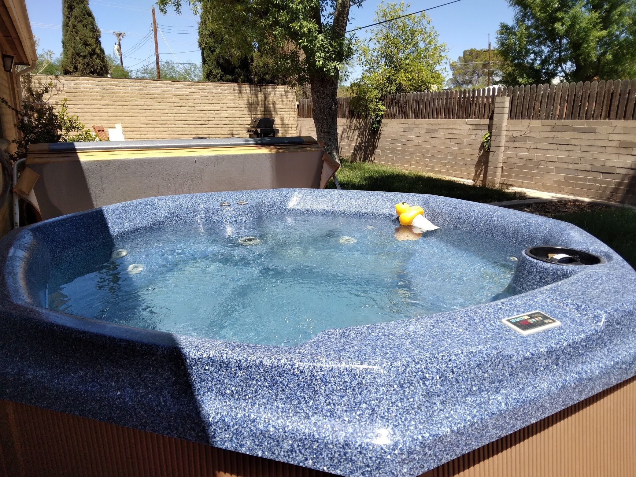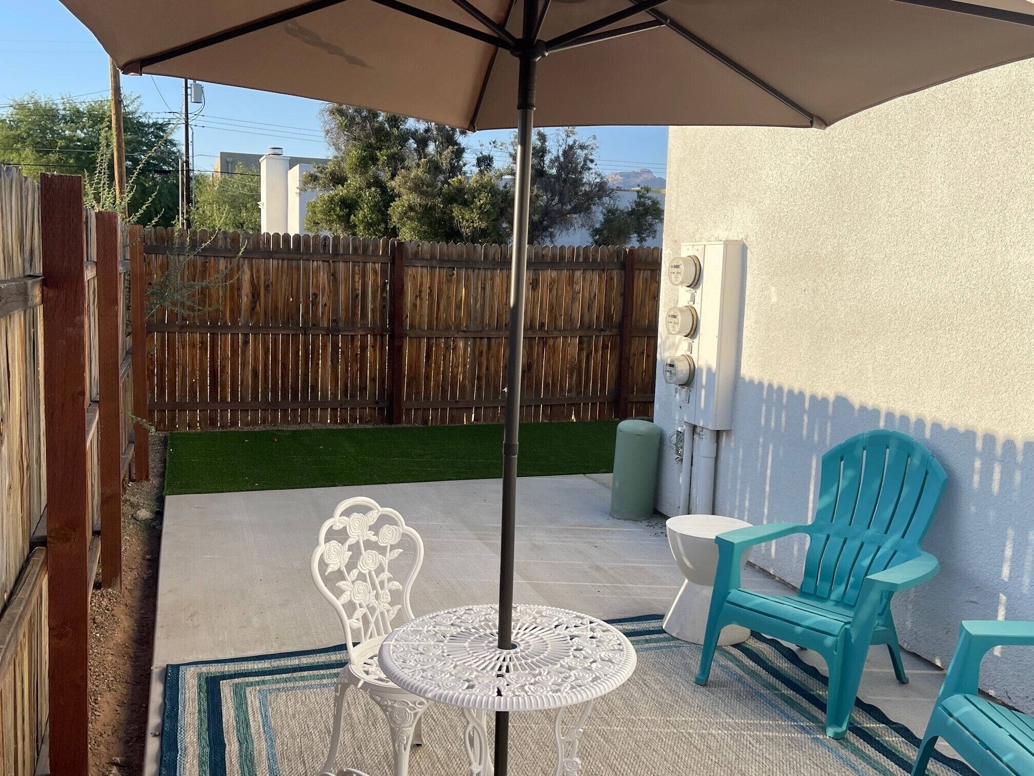A large private fenced back yard has a soothing hot tub, bbq, firepit, swing. A great place for family and pets to play! A huge mesquite tree with twinkle lights provides shade and charm. The 5 person hot tub sits under a twinkle lighted ramada. Tiki torches provide a vacation ambiance. There are 4 extra chairs to sit around the fire pit. The glider swing is a great place for morning coffee.