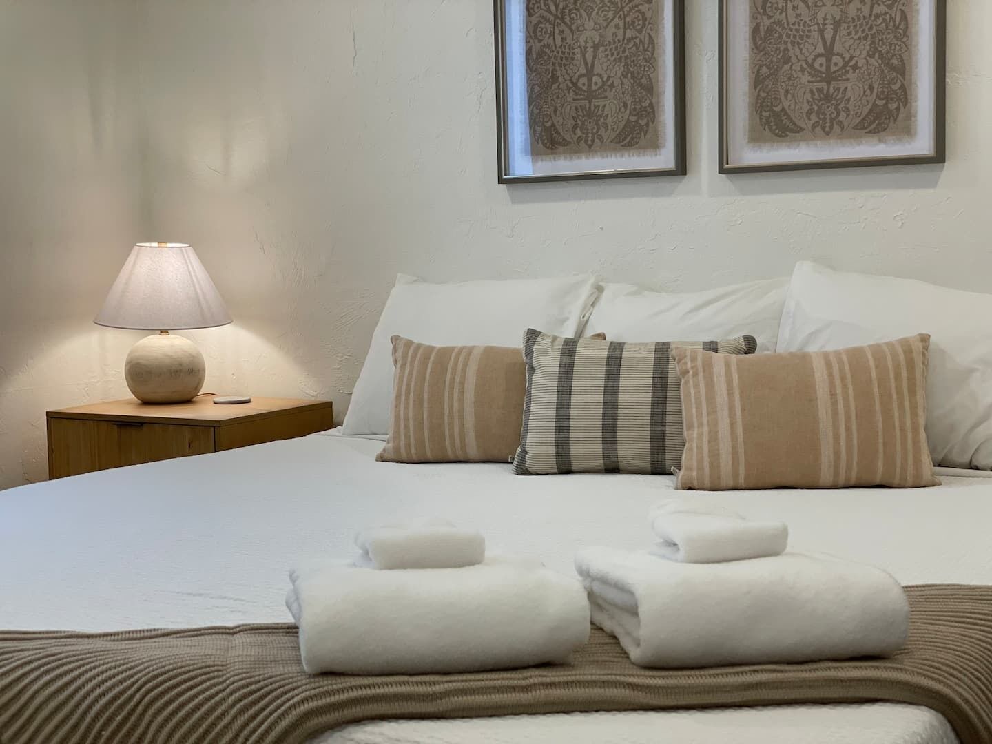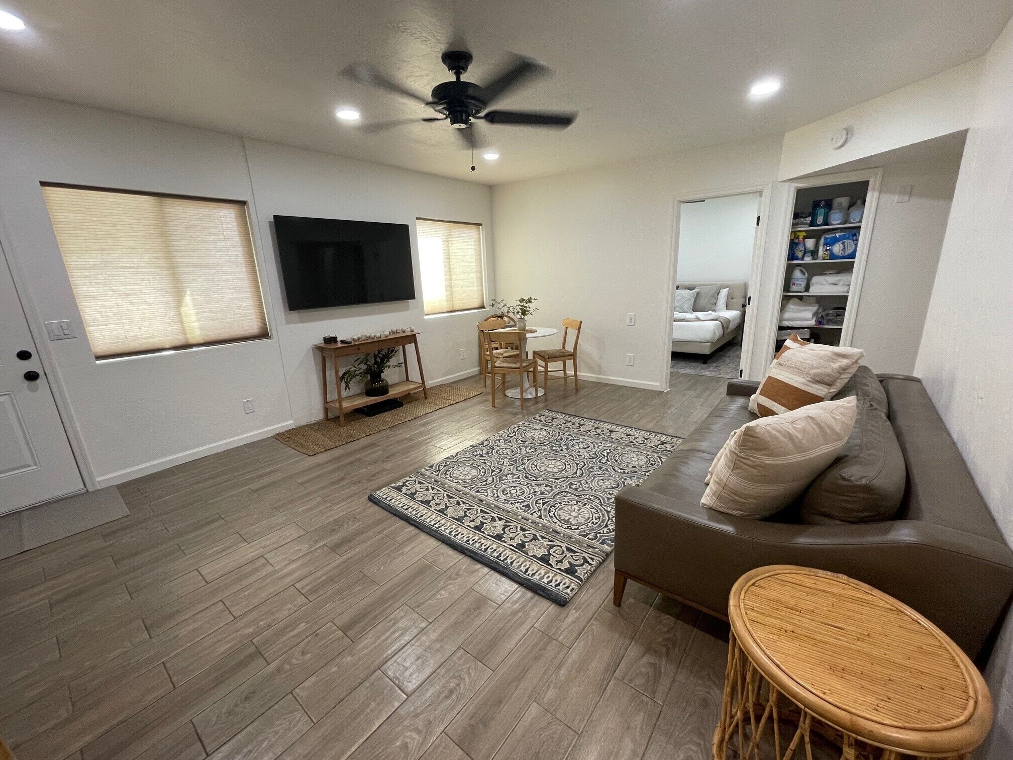 This cozy 2-bedroom, 2-bathroom casita features an open living/dining area and a mini kitchen with essential appliances (no stove). The bedrooms offer comfortable beds, spacious storage, and private bathrooms. Amenities include a flat-screen TV, Roku, free WiFi, excellent A/C & heating, ceiling fans, well water, and covered parking.