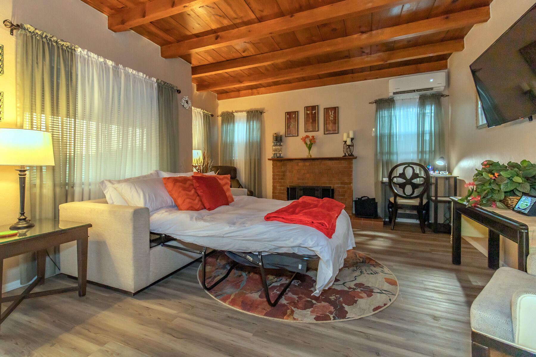 The living room has wood beamed ceilings and a fireplace (ornamental at this time). A pull out sofa turns into a full sized bed with an extra thick memory foam mattress, it will sleep 2 more people for short term guests. With super fast wifi, Alexa, a library, smart lights, a smart 50’ Roku tv, a massage chair and a work station with a light and supplies is the perfect place to chill out after cruising Tucson’s amazing sights.
