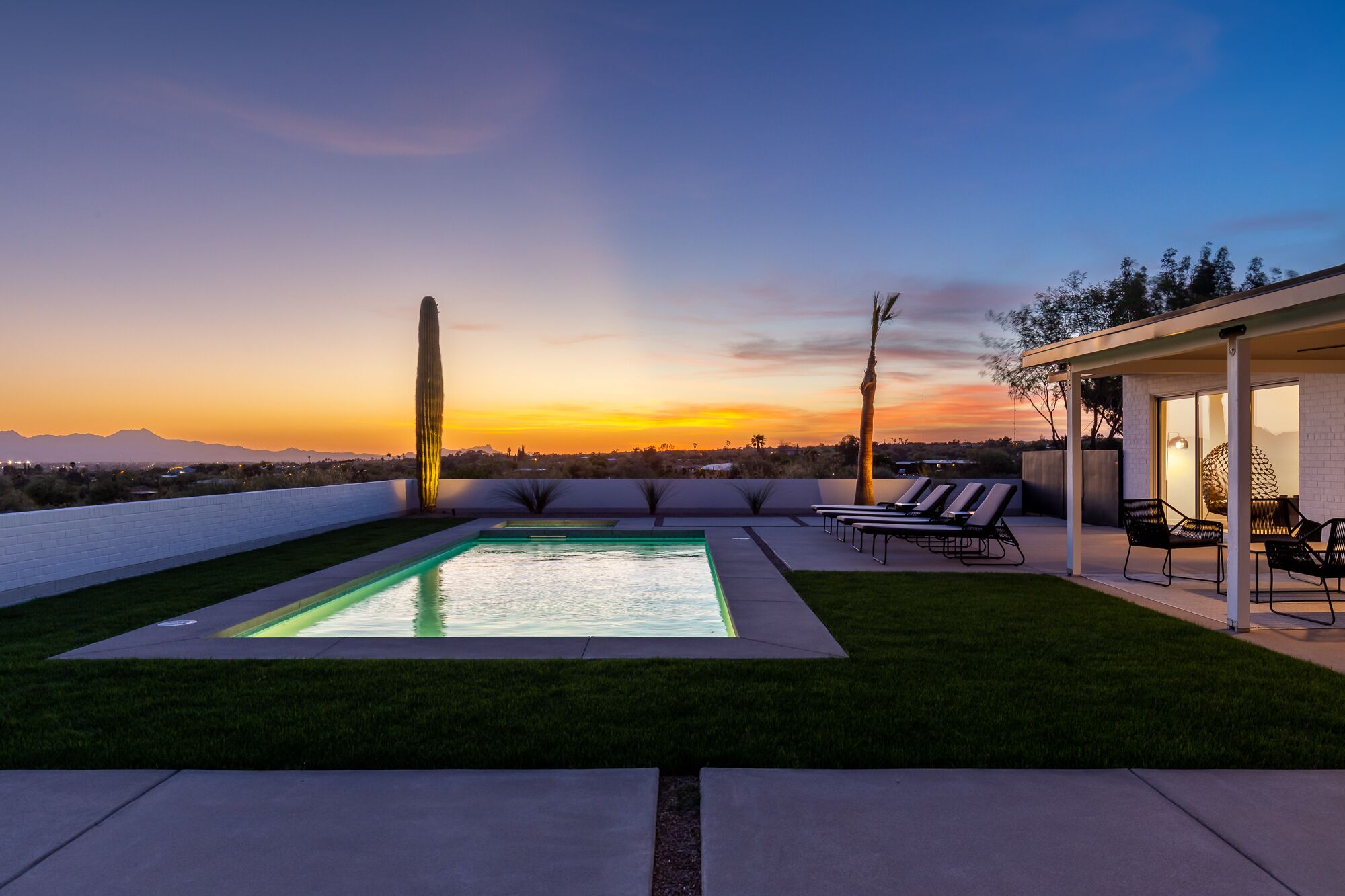 Kick back and relax in this stylish mid-century modern hideaway. Sitting on an elevated one acre lot in the Catalina foothills, with beautiful city and mountain views. The Tucson skyline twinkles below this open-concept home, allowing for optimal relaxation by the pool and a glass of wine by the open air fireplace as the sun sets magically behind you.