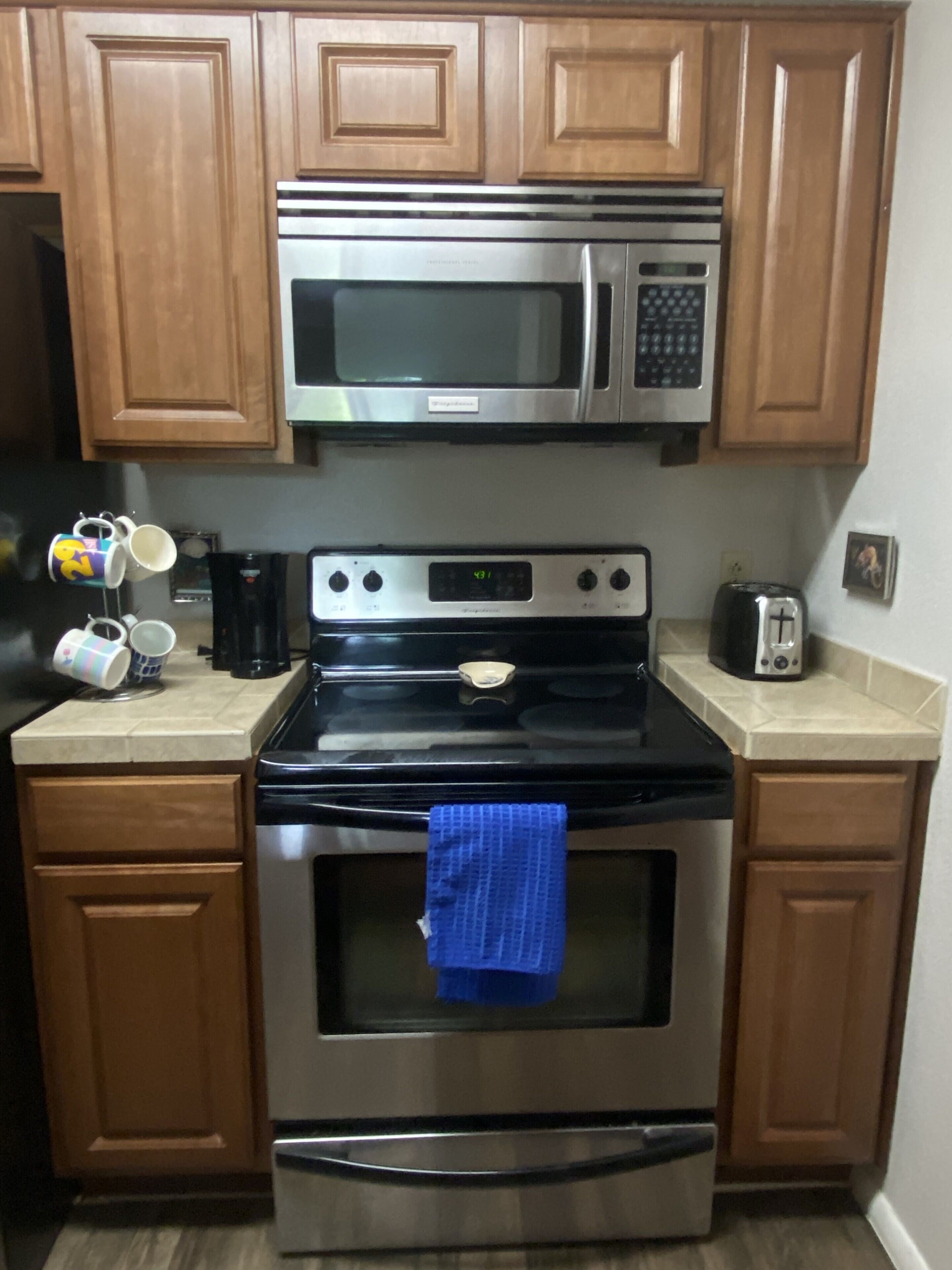 A large kitchen seats 6, with place settings for 8. It has everything that you can imagine to cook or bbq with. It has a gas stove and a double refrigerator with filtered water and ice maker. The sink also has a water purifier and the house has a whole home air purifier to keep things smelling clean and keep germs away! Some of the amenities are, a drip coffee pot, full sized tea kettle, blender, mixer, toaster oven, crock pot, coffee grinder and more are already here. There is even a turkey roaster for family holidays. Spices, condiments, teas, coffee, sweeteners, cleaning supplies, baggies etc. are here.
