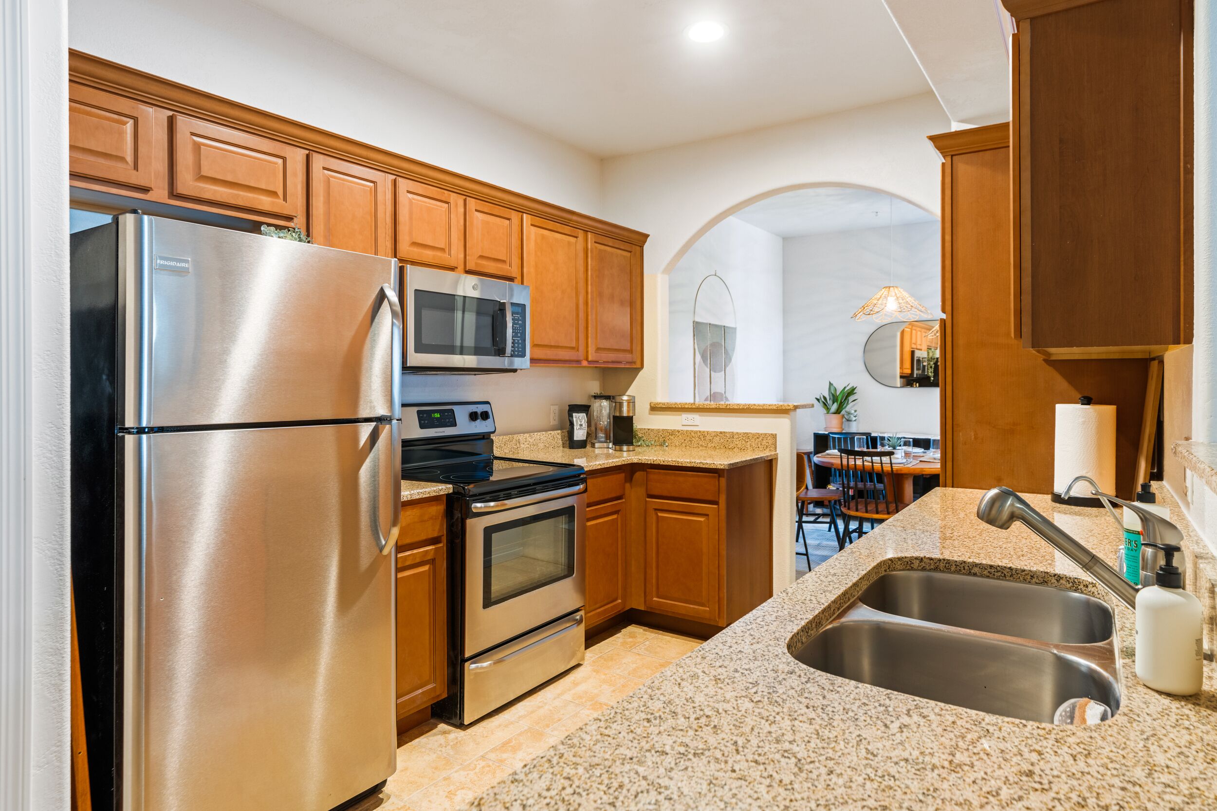 Come and enjoy all that Tucson has to offer. The Heart of Tucson is located next to the Tucson Mall shopping and dining district and the Rillito River Walk is right outside your front door! It's convenient North Central location means it is easy to get anywhere in Tucson. This three bedroom, two and a half bath condo has an excellent open floor plan with vaulted ceilings and just under 2000 sqft of living space.Walking up to the home you will be taken with the charming southwestern touches, such as the warm Santa Fe inspired colors, copper garage, and rustic wooden entrance door, that leads to the private front courtyard replete with pioneer style accents. Walking through the front door you will enter the foyer with stairs leading to the above bedrooms and loft area. To the left you will find a small hallway alcove that invites you into the open Kitchen and dining area, continuing the Sonoran theme with festive and tasteful touches like two historic church pew benches boasting colorful murals by a local artist. The living area features a large leather couch and complimentary leather club chair with ottoman, where you can relax while watching your favorite show on the flat screen television that sits atop a beautiful wood entertainment console. You can easily enjoy relaxing in the living area while entertaining or cooking in the spacious kitchen with the generous breakfast bar and island that bridges the kitchen and dining area to the living room. The kitchen features light tan granite countertops that make for a stunning contrast agains the dark walnut cabinetry. Sleek black appliances and a glasstop stove give this kitchen a modern streamlined look that keeps it simple and elegant.Just off of the dining area you will find a sliding glass door leading out to the back yard with it's colorful brick patio and native plants. Moving past the kitchen to your left you will find a short hallway leading to the half bathroom with pedestal sink and the laundry room with full sized washer and dryer directly across the way. Moving down the hall a little further you will find the garage door. Going back to the entrance foyer and taking the stairs to the second floor you will find a small landing and then continue to the top of the steps where to your left you will find the loft featuring a small seating area with a futon that can be used to accommodate additional guests. Directly to the right of the stairs you will see the entrance into the spacious master suite. The Master Suite has a king size bed with a beautiful southwest metalwork headboard that sits against and perfectly compliments the cheerful terra cotta orange accent wall reminiscent of Tucson's famous sunsets. The room also has two matching nightstands, a large leather couch to the right and a stunning easel-mounted full length mirror. The master suite features a flat screen television that sits on a large seven-drawer dresser. There is additional wardrobe storage in the armoire located to the left of the bed next to the passage that leads to the master bathroom. The master bathroom features a private water closet, walk in shower with glass door and large double sink vanity with an additional vanity inset. You will also find the spacious master closet adjacent to the vanity. The closet features built-ins as well as a carousel shoe rack. Moving out of the master suite and back into the loft area you will find the guest bathroom with a shower and tub combination and the nearby linen closet with plenty of extra linens. Just beyond the guest bathroom you will find the first guest bedroom with a beautify decorated queen size bed. The bed set features a bright goldenrod motif and equally cheerful light green dresser. Their is a small nightstand with additional lighting to the right of the bed and a small desk area against the far wall with a computer flat screen and plenty of writing space. The Guest bedroom features access to the upstairs veranda, and has a sliding door closet. Just to the left of the first Guest room you will find the second guest bedroom. This bedroom features a dark walnut wood trundle bed with an additional twin mattress you can extend for quick and easy sleeping accomodations. Their is also a small nightstand with a reading lamp, a brown walnut bookcase for additonal storage and a smaller matching book case featuring a flat screen telivision. The second guest bedroom also has access to the upstairs veranda.The upstairs verand features beautiful views of the Tucson Mountains as well as the Rincon Mountains. You will also be treated to a lovely vista of the city lights as the sun sets.If you would like to take a scenic walk in our beautiful Tucson weather you can easily do so by stepping out your front door and onto the Rillito River Walk. Anytime of day or evening you will find people jogging, walking, or bicycling this well planned path that follows the Rillito River Wash.You can also opt to take an invigorating swim or relaxing sit in the community pool and spa.Home also comes with High Speed Wireless Internet, land line, and cable TV. This is a wonderful home in a wonderful location that will keep you coming back year after year. Come, experience Tucson in 'The Heart of Tucson'.