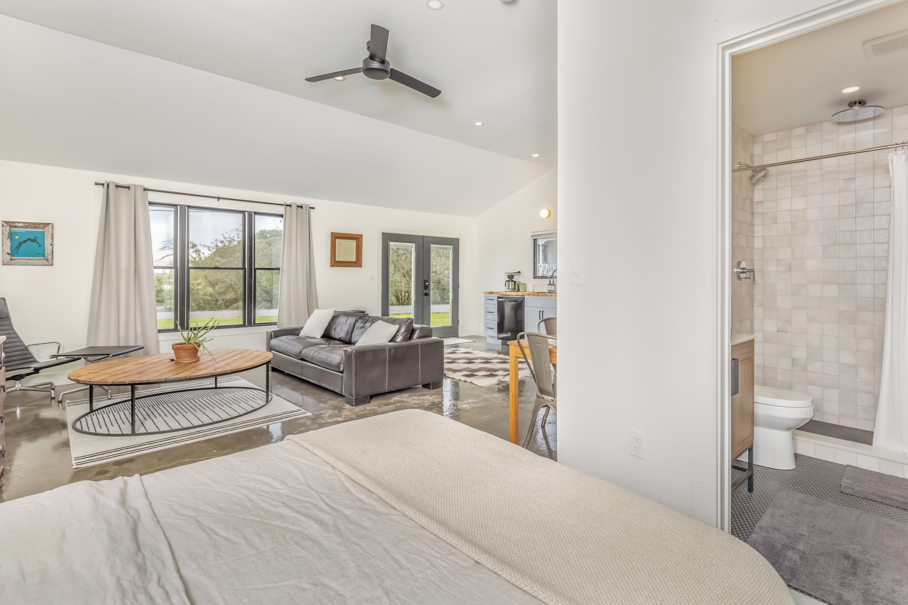 Large room with sleeper sofa, cable tv, wifi, microwave, mini-fridge, coffee maker and hot water pitcher with cups. Not a full kitchen, but one is available with extra room rental options. Sitting table and chairs, and French doors that open onto an airy wrap-around porch. Spacious corner bedroom with queen size bed , dresser and closet. Full bath with shower.