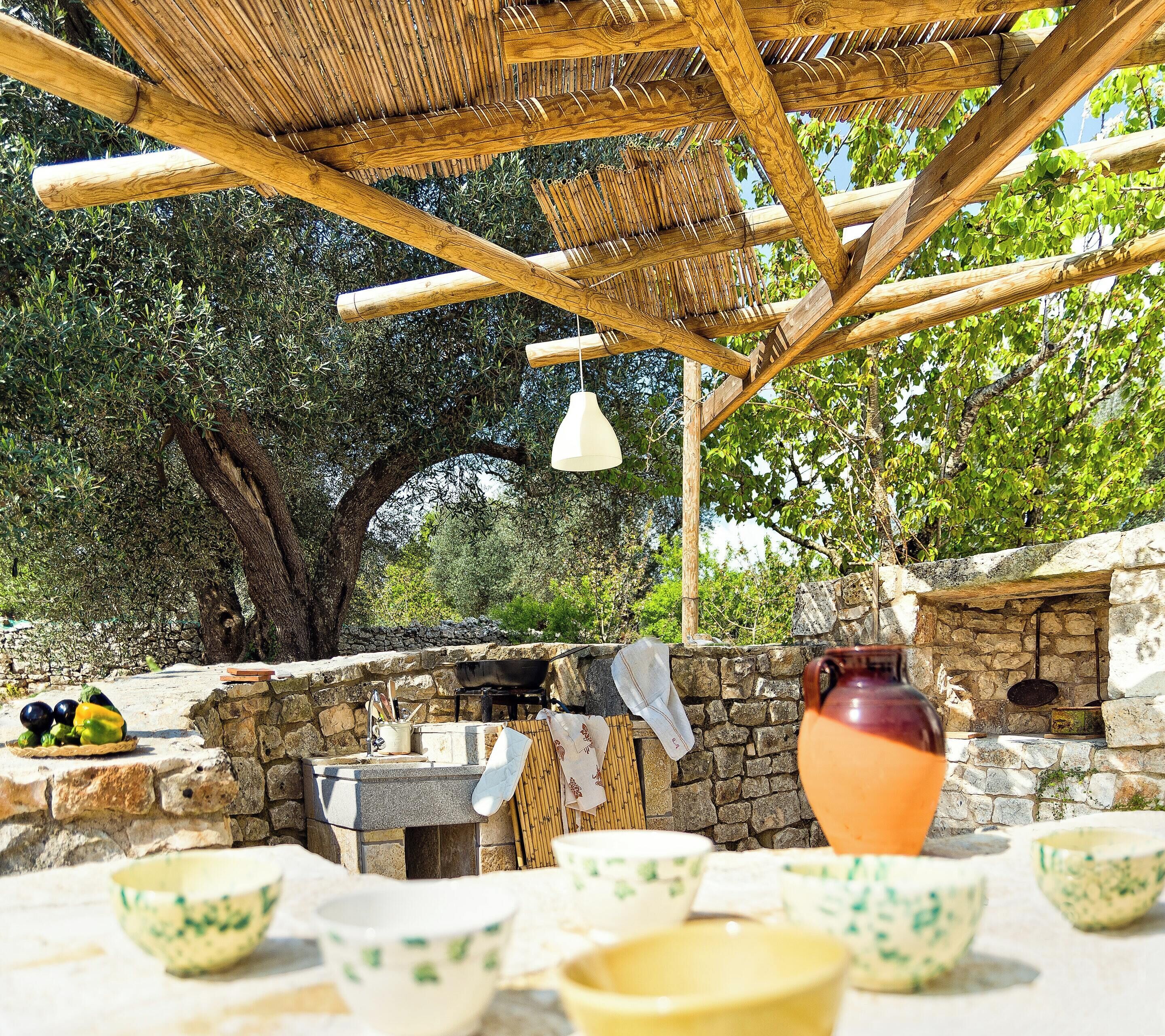 The swimming pool, solarium, 7000 square meter garden, parking and barbecue are shared with the other two guests of Trullo Gabriele