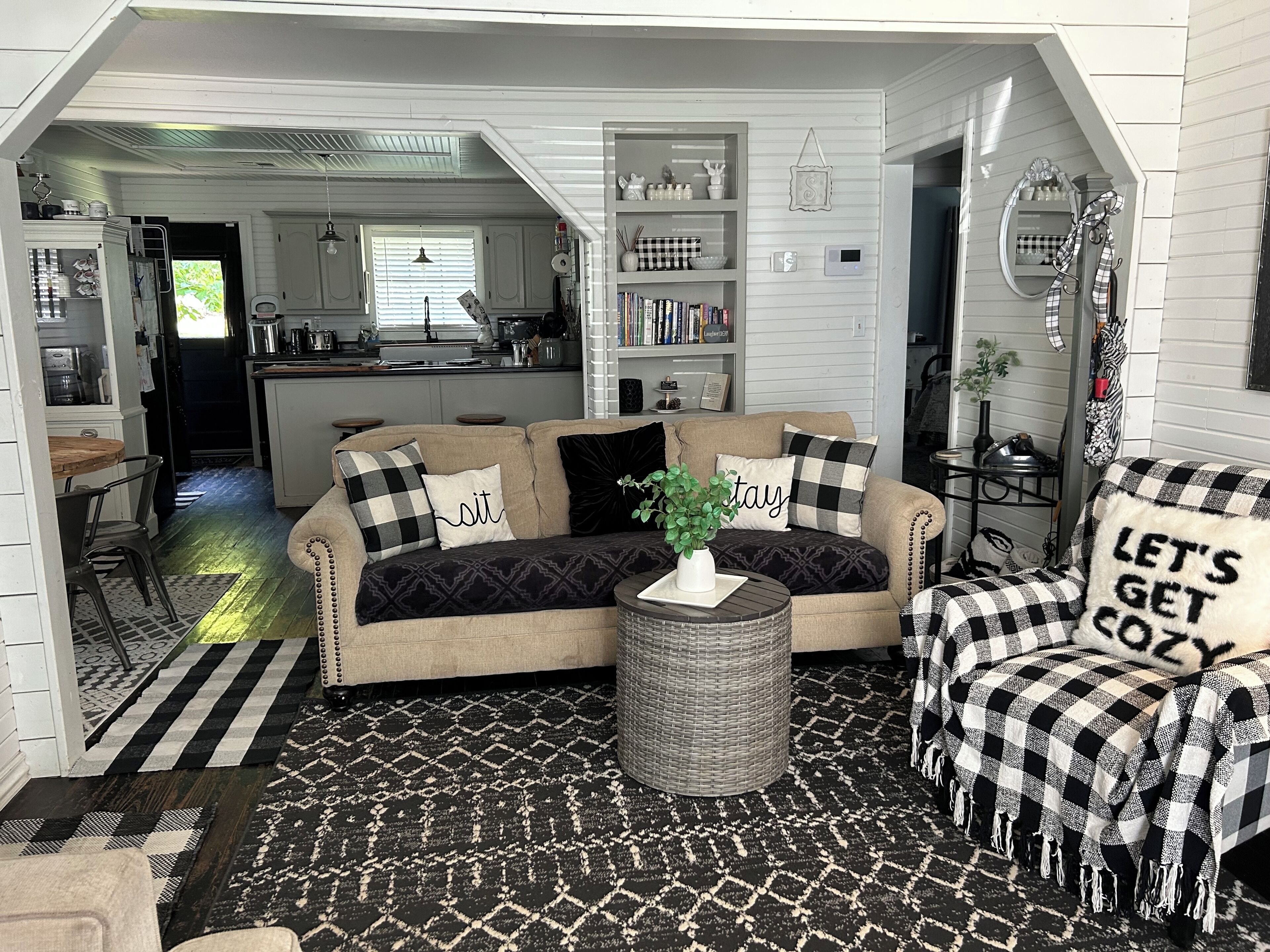 This newly remodeled open concept farmhouse has 3 bedrooms, 2.5 baths, 2 living areas, office & a full kitchen! Can accommodate 9 guests in the bedrooms & 2 in the living room.