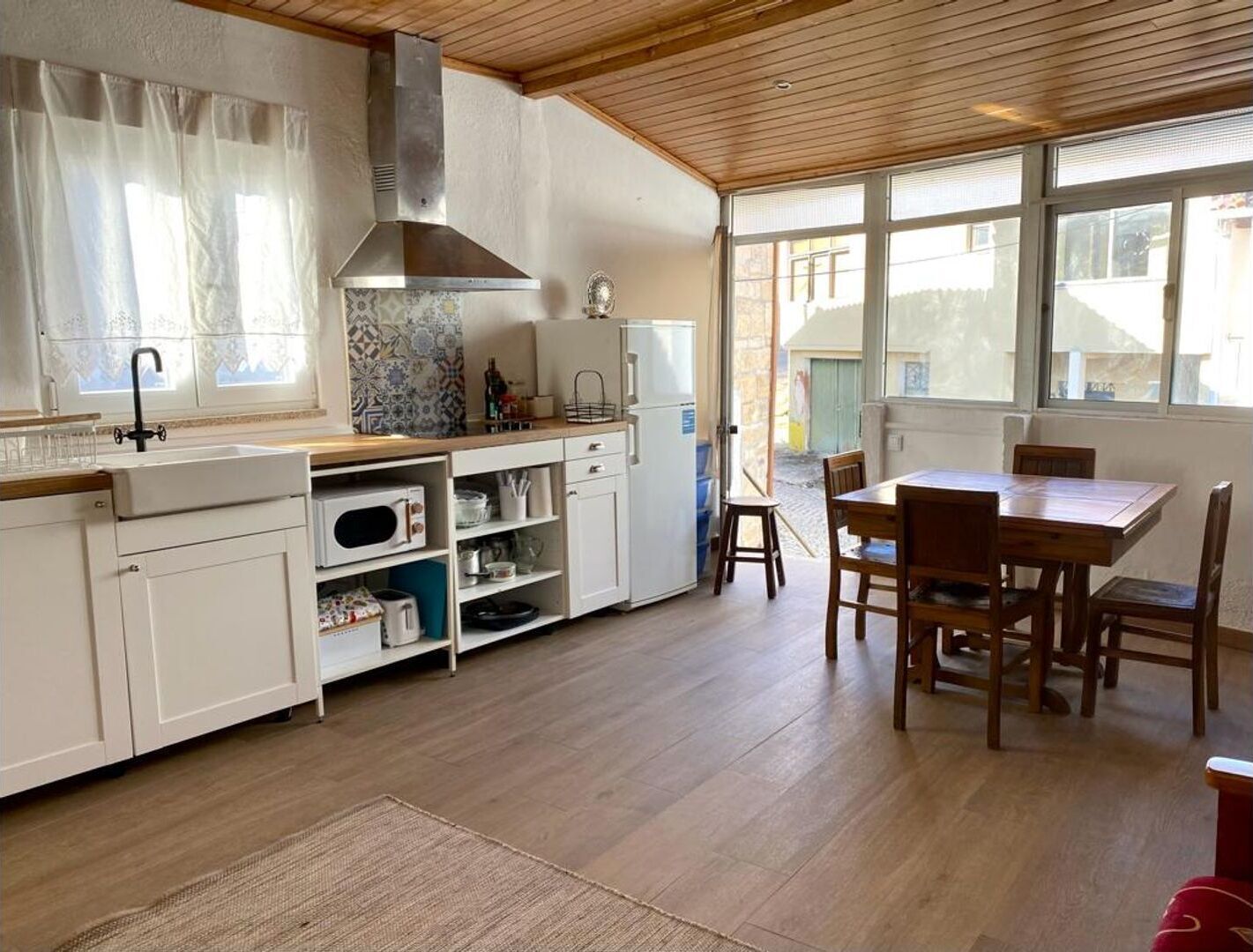 The kitchen is fully equipped with oven, hob, washing machine and some small appliances such as microwave and electric coffee maker. Washing the dishes (with a view of these) has never been so pleasant!