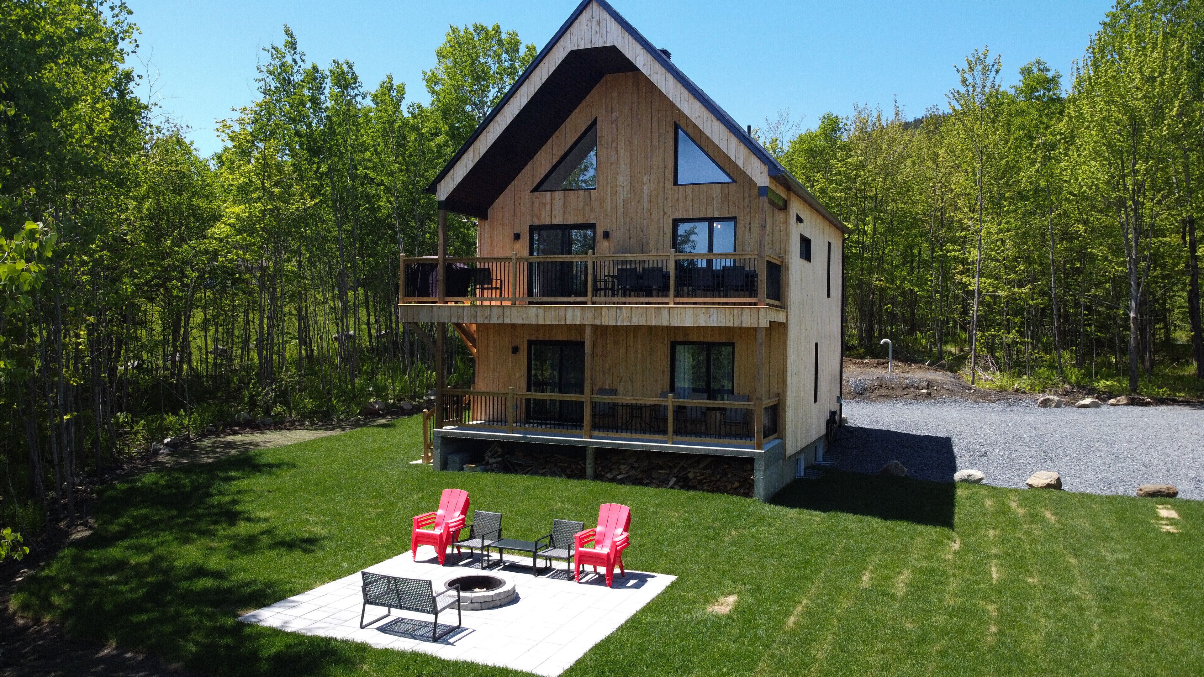 This Scandinavian chalet in Coaticook offers 5 bedrooms, two terraces and a magical view of Mont Pinacle.