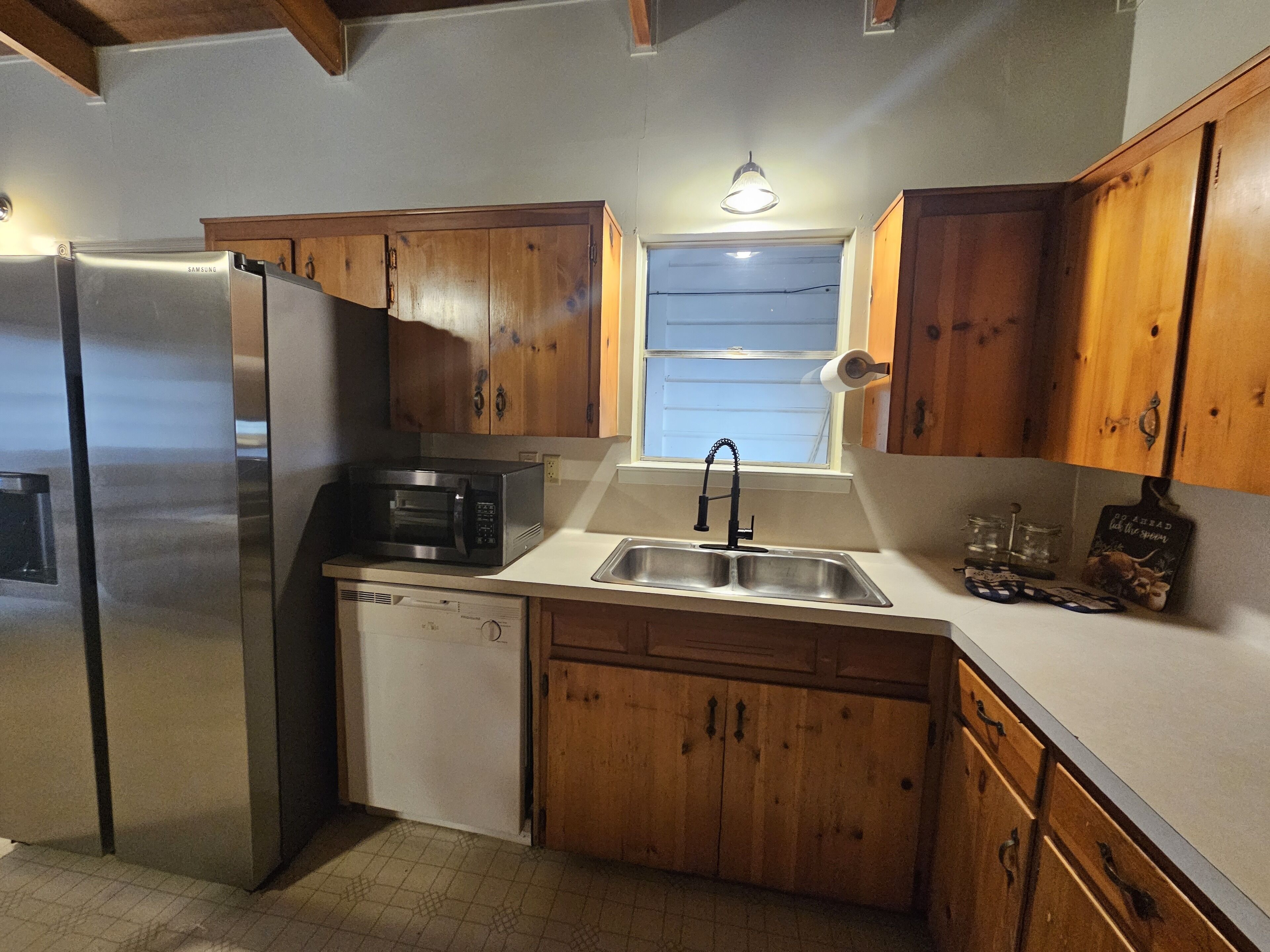 KITCHEN: Refrigerator, stove/oven, drip coffee maker, microwave, dishwasher, dishware & flatware