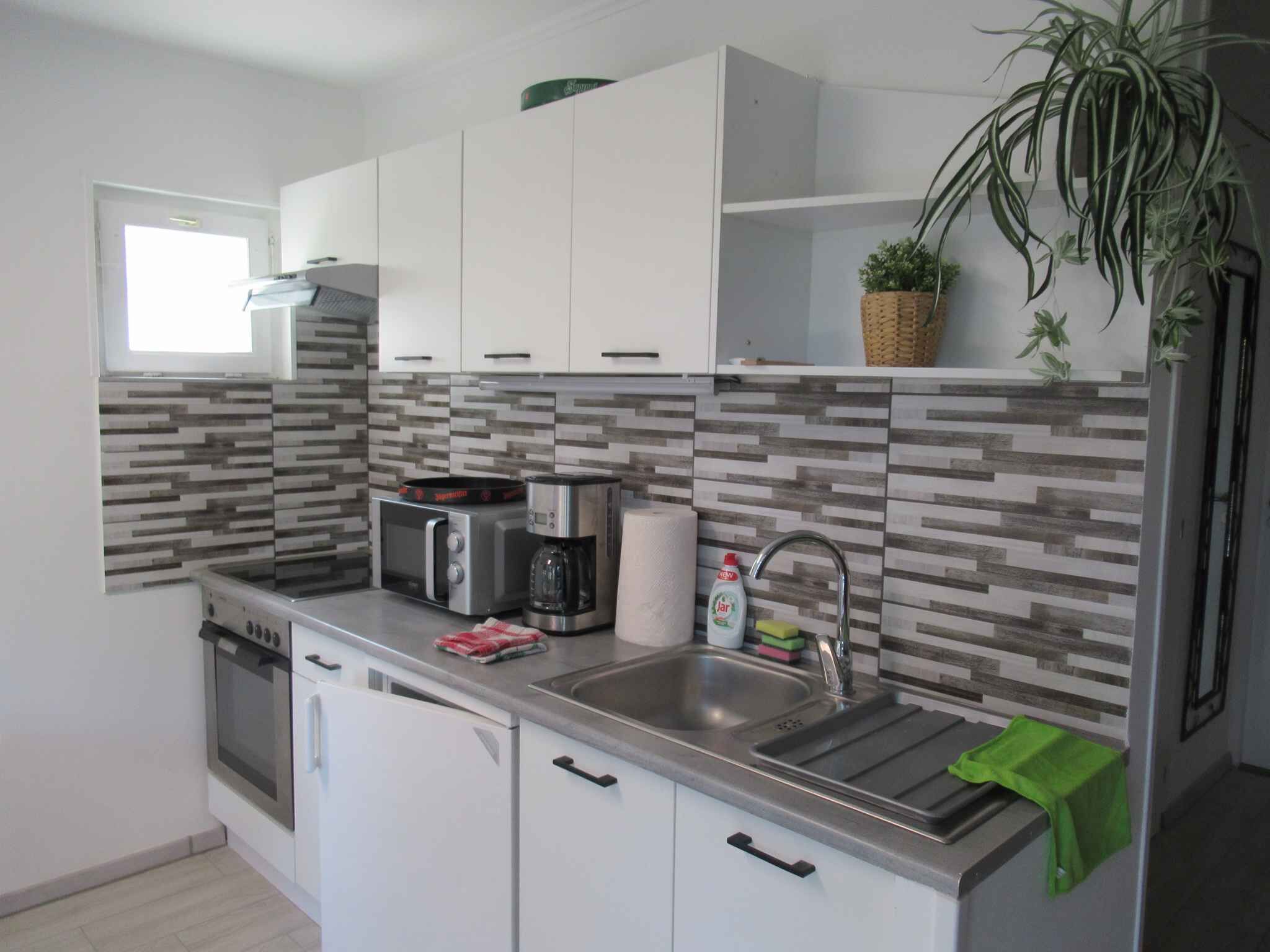 The entrance to your holiday apartment is on the 2nd floor. Living/bedroom with 2 additional beds on a double sofa bed, sitting area, TV, radio and access to the terrace (garden furniture, sunshade). Bedroom with 1 double bed. American kitchen with dining area, electric stove (ceramic hob), oven, refrigerator, microwave, coffee machine and toaster. Bathroom with shower, 1 washbasin and WC.