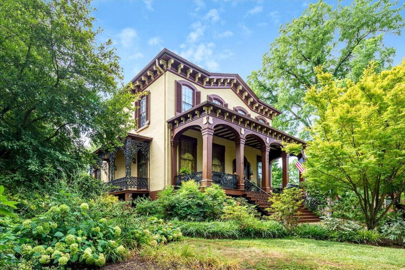 The Hill Mansion is a three level historic home with 3 bedrooms and 3 baths on the upper level, 2 bedrooms and 1 bath on the lower level, powder room on the main level. There are steps up into the house and down into the English basement.
