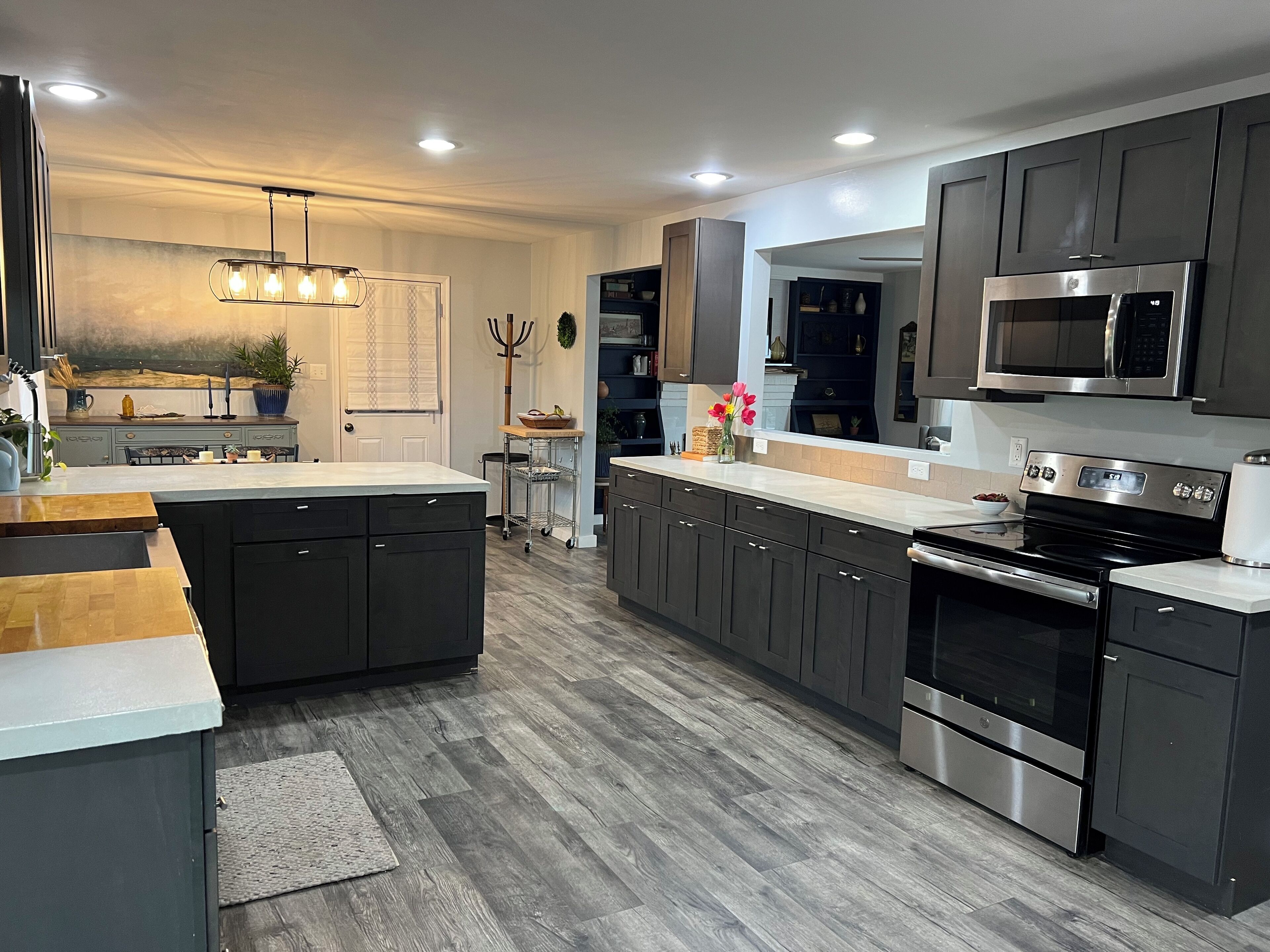 As soon as you step inside, you will be greeted by a bright and modern living room with a beautiful grand piano that can automatically play from a selection of music, featuring comfortable seating and large windows that let in plenty of natural light. Strolling further into the home, you will find an even larger living room with an expansive couch, beautiful mural on the wall, 85" 4K TV, and electric fireplace. The attached kitchen is fully equipped with all the amenities you need to whip up delicious meals during your stay. Whether you prefer cooking indoors or grilling outside on the Blackstone griddle, our home has got you covered.