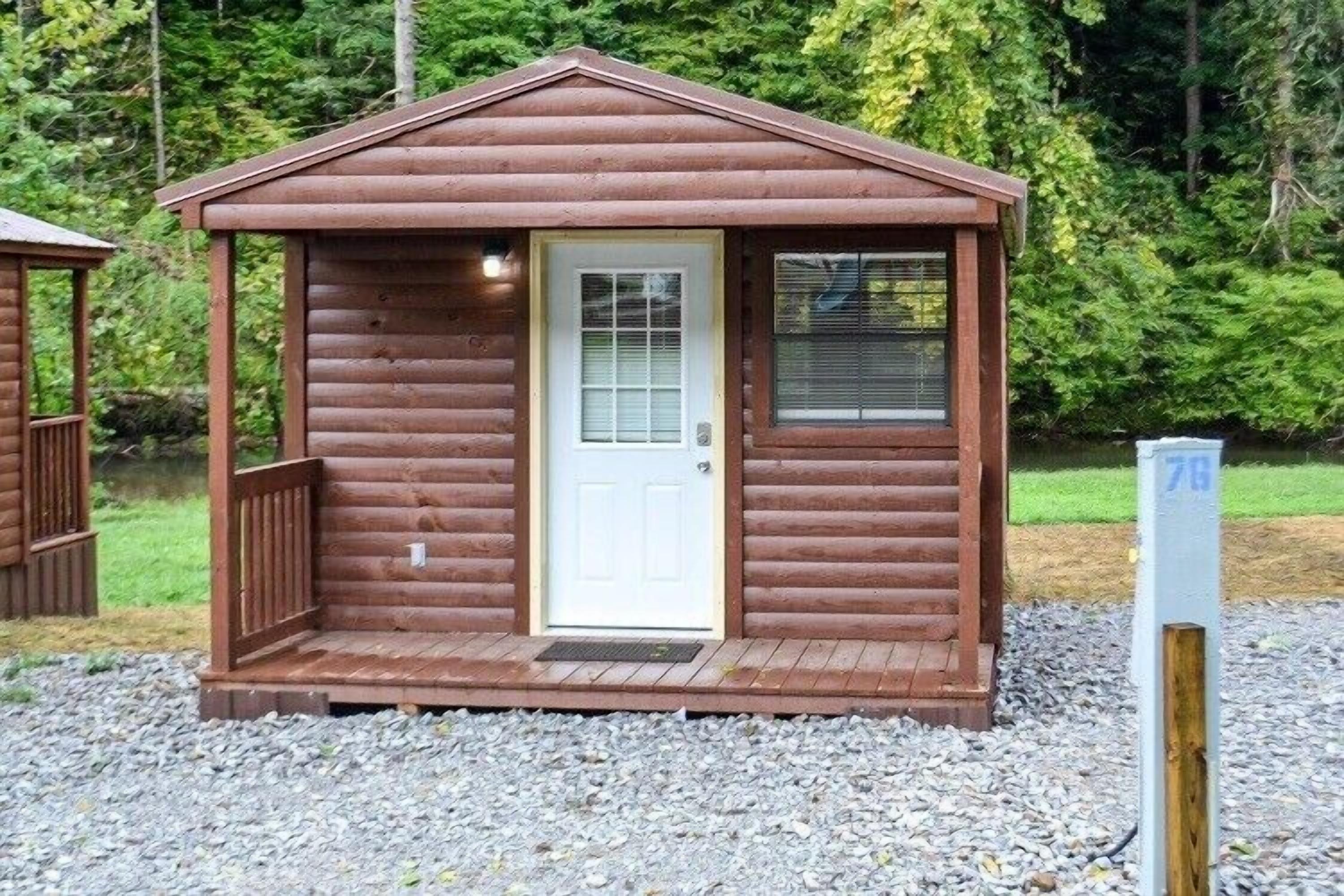 These Cabins are creek front and located in the beautiful East Tennessee area at River Forge RV Park and Campground. The cabins are 1 room with 2 full size beds. Cabins are climate controlled with heating and air. The bathhouse is located right behind the cabins, and they include a separate men's and women's shower, bathroom, and vanities. (THERE ARE NO BATHROOMS IN THESE CABINS!) The laundry mat is also located in the bathhouses facing the cabins. The cabins have a dorm refrigerator and microwave. Also available on the property is a playground, community firepit, and pavilions. Come to our country market located at the entrance of the property for all your basic commissary needs. In addition, we serve breakfast and lunch at the country market!!! Enjoy a scenic hike along the creek or simply relax on your own private back porch.