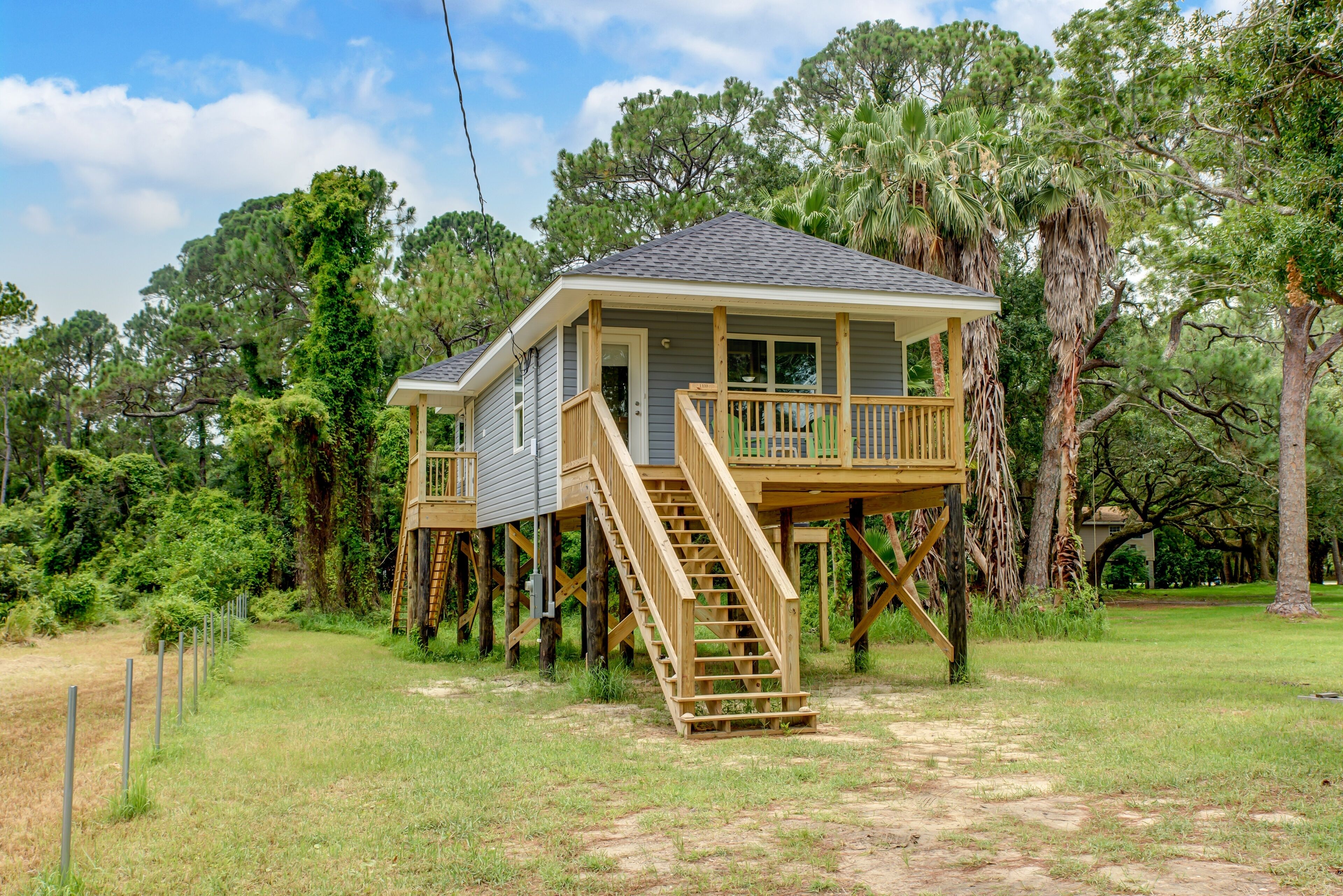 This new two-bedroom cottage sets up high with a treehouse feel.