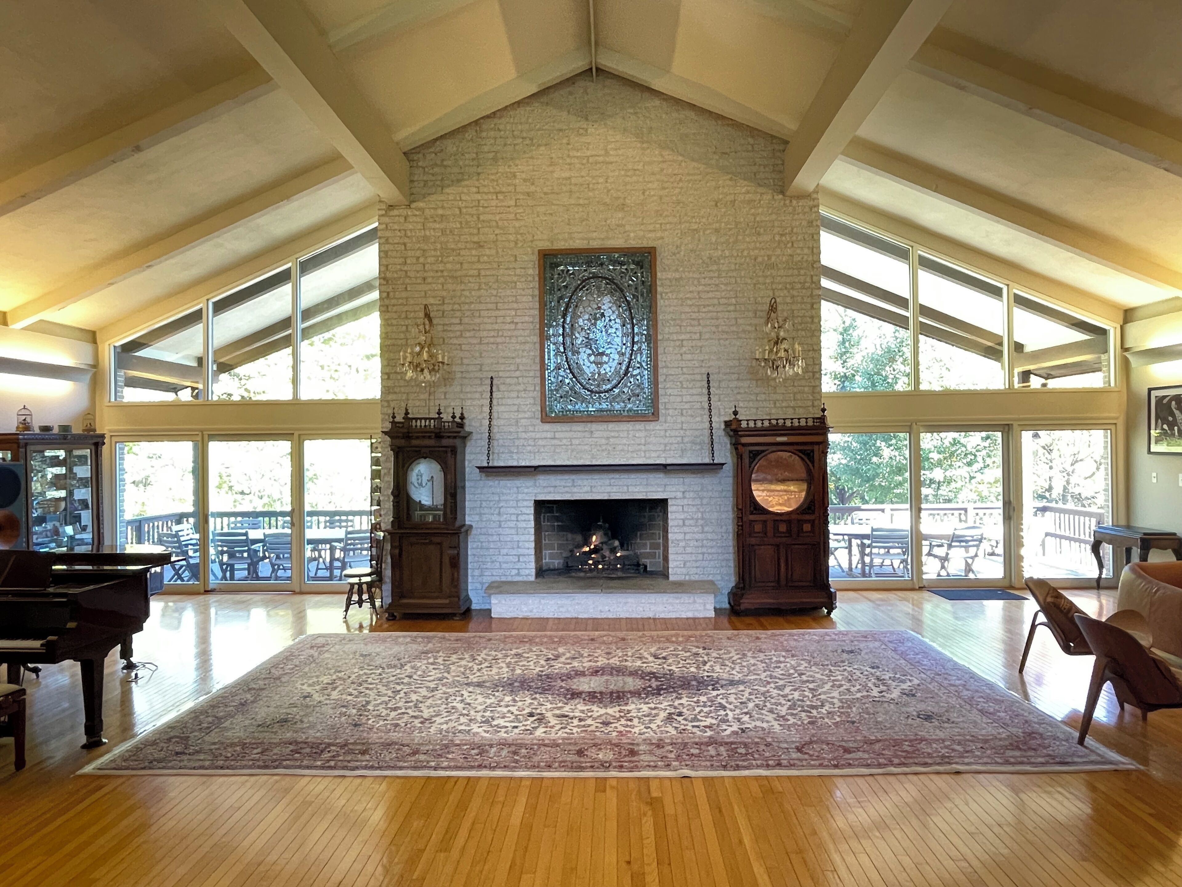 The fully equipped kitchen has lots of natural light from a well-centered skylight. Boasting a beautiful stone countertop and tile backsplash. A dining table ready for tasty meals, adjacent to the kitchen. An amazing living room area with a stone fireplace, coffee table, and sofa. Large bay window providing light from the front lawn.