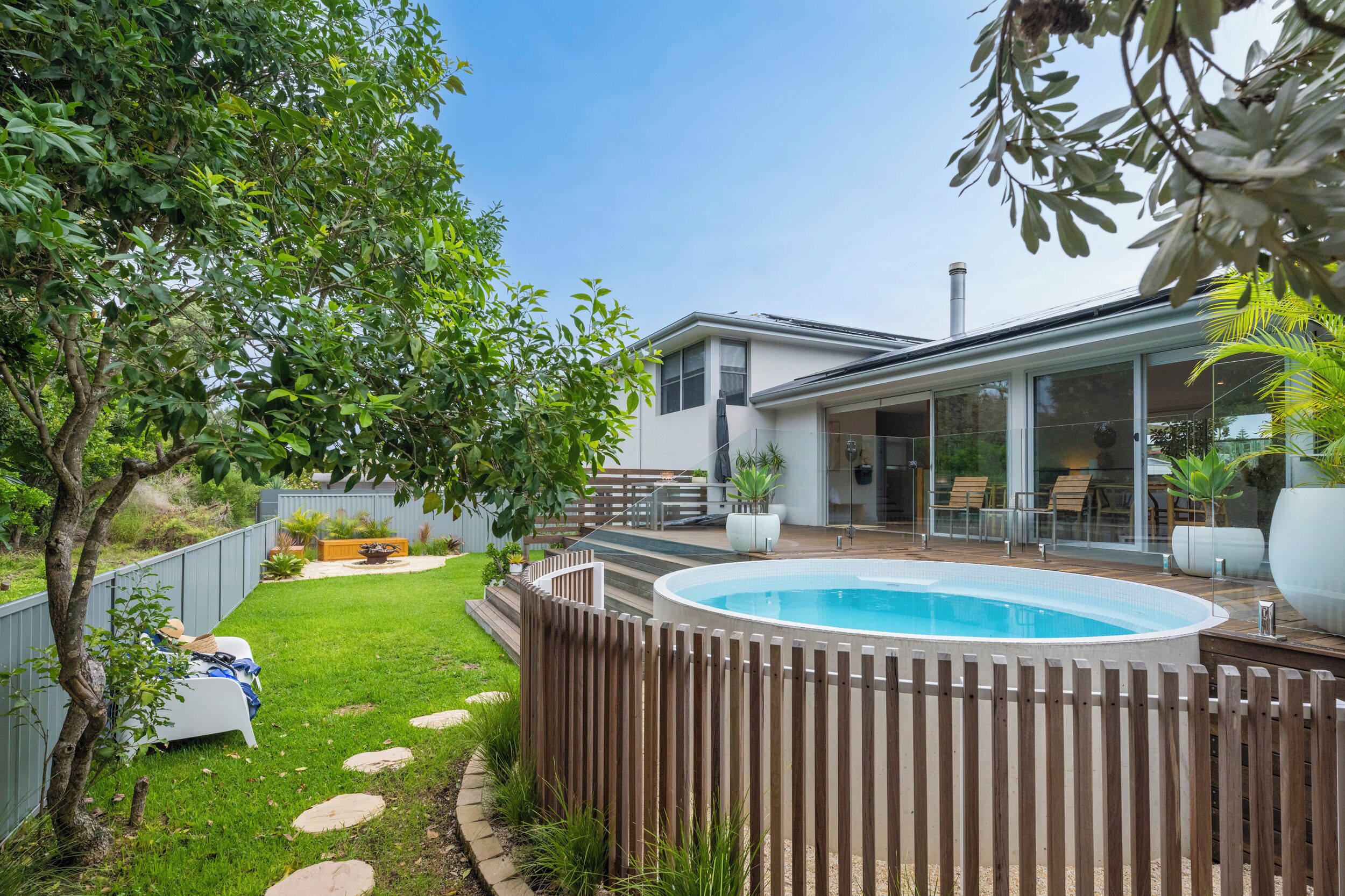 Immerse yourself in the quiet getaway destination of Diamond Beach on the mid North Coast in this beautifully styled two level five bedroom home with your own swimming pool there is plenty of space for everyone to have their own space and to get together as well, all located only minutes from the beach.