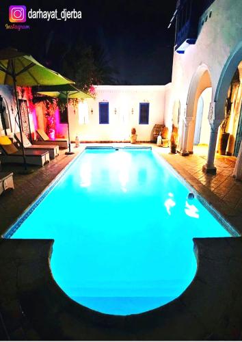 A good location for a relaxing stay in Houmt Souk, Dar Ennour Djerbahood Erriadh is a bed and breakfast surrounded by views of the city. The property features an outdoor swimming pool, free bikes, and parking on-site among other facilities. This bed and breakfast features air-conditioned accommodations with a patio. The accommodation provides a hot tub, free Wifi throughout the property, and family rooms. The units come with tiled floors and feature a fully equipped kitchen with a dishwasher, a dining area, a flat-screen TV with satellite channels, and a private bathroom with hot tub. A terrace with an outdoor dining area and garden views is offered in all units. At the bed and breakfast, all units include bed linen and towels. The bed and breakfast offers a buffet or continental breakfast. A mini-market is available at the bed and breakfast. You can play billiards at Dar Ennour Djerbahood Erriadh. Guests can also warm up near the outdoor fireplace after a day of walking tours. Djerba Golf Club is 12 miles from the accommodation, while Lalla Hadria Museum is 13 miles away. Djerba–Zarzis International Airport is 6.8 miles from the property.