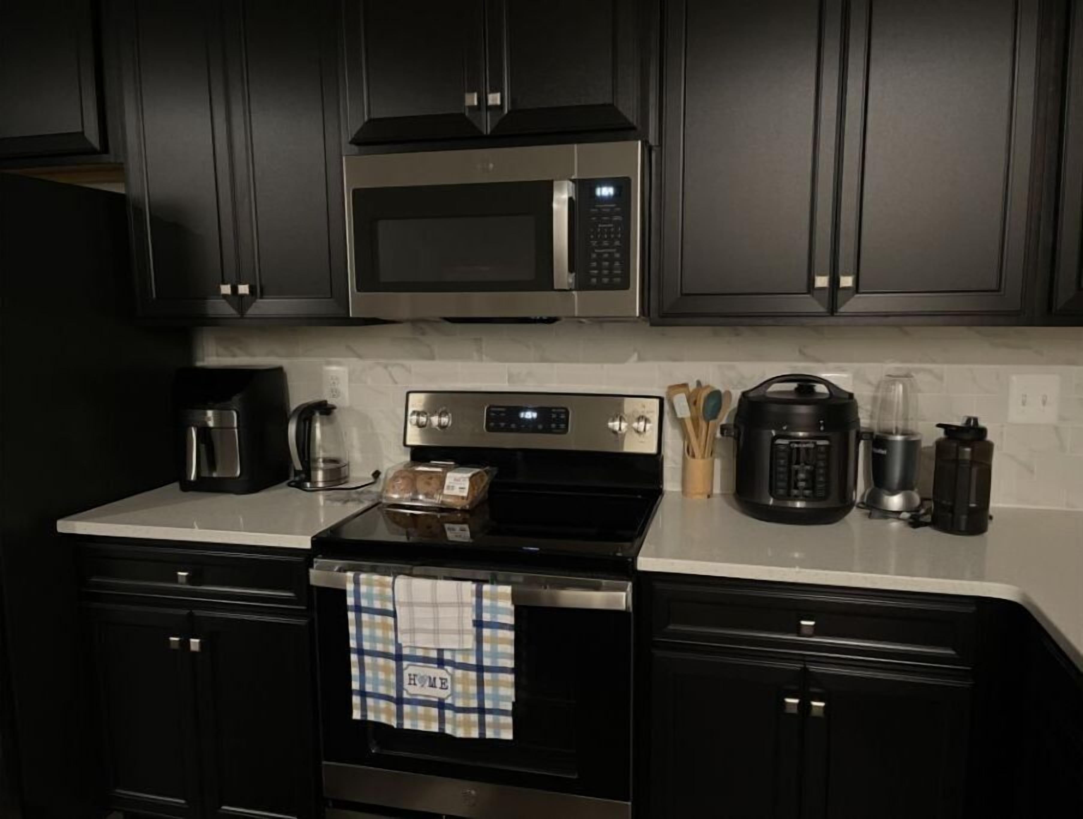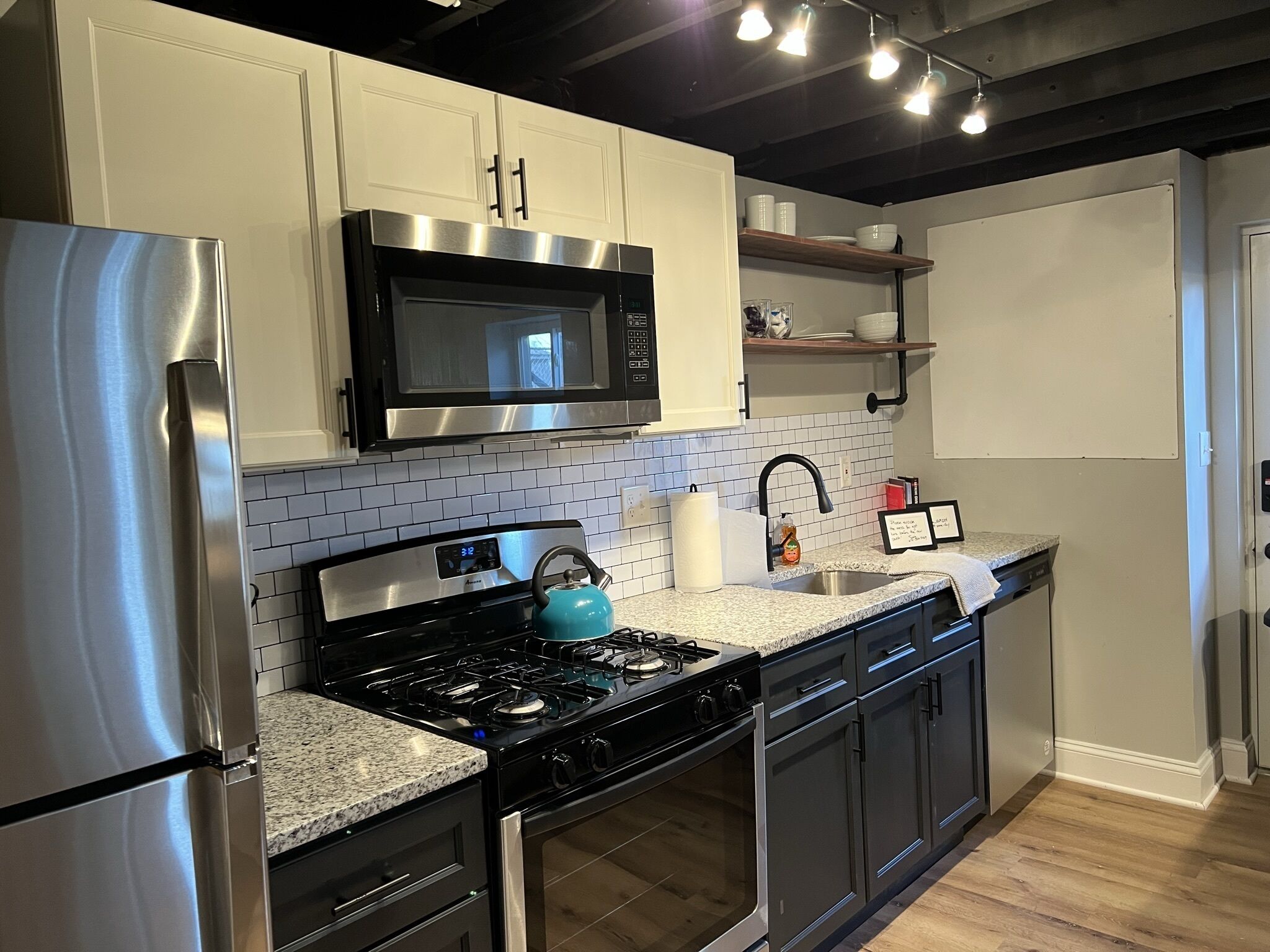 KITCHEN: Cooking basics, spices, dishware/flatware, dishwasher, refrigerator, stove, microwave, drip/Keurig coffee maker, K-cups, electric kettle, toaster