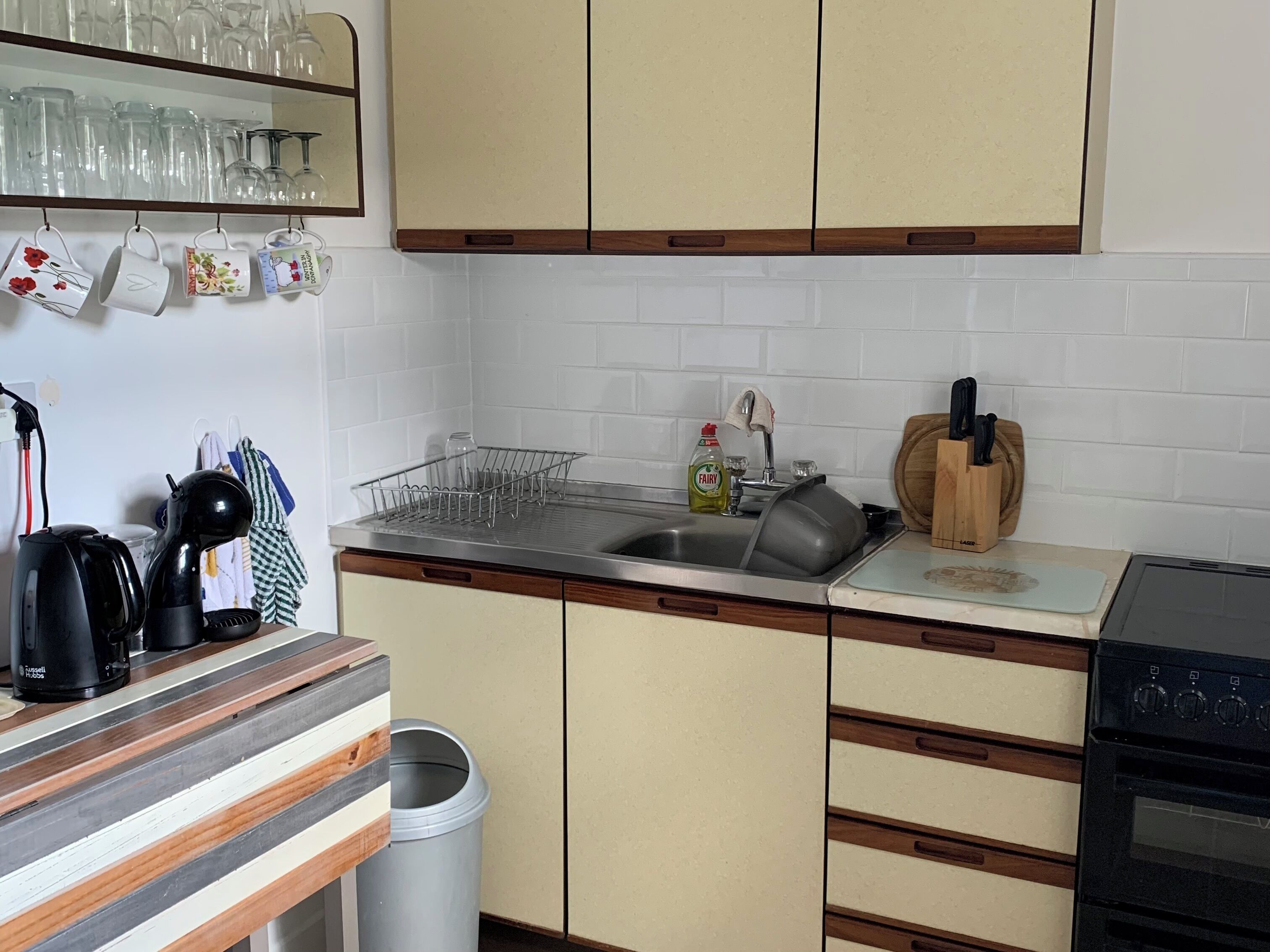 - Fully equipped kitchen. Oven with electric hob, microwave, dishwasher, fridge/freezer, kettle, coffee maker and toaster. There’s also a washing machine and separate sink.