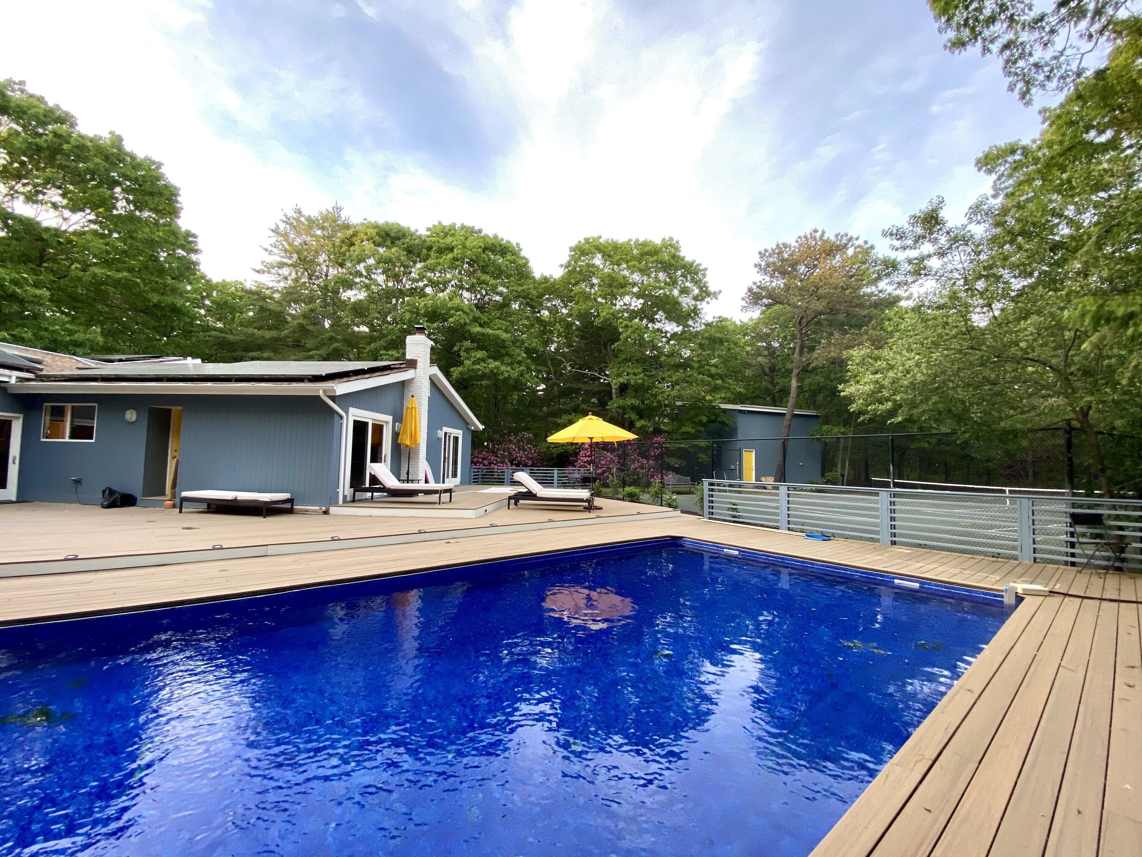 Enjoy a peaceful and private getaway at this 1,303 square-foot property with solar panels on the roof and surrounded by trees in East Quogue. As you walk up to the home, you will notice the charming front porch, perfect for basking in the crisp Hamptons air with a cup of home-brewed coffee. The tastefully-decorated interior features hardwood floors and windows in every room, allowing natural light to pour through. Relax and cozy up in the living room with two comfy couches, a stone fireplace for those cooler nights, and a flat-screen TV for watching a movie or the ball game. In the kitchen, whip up a delicious breakfast with stainless steel appliances and share a meal at the five-person table. There is a desk adjacent to the kitchen should you need to check on work. Doors between the kitchen and the desk lead to the back. Play cards and catch up on the covered porch with a skylight and a small table overlooking the pool and gardens.