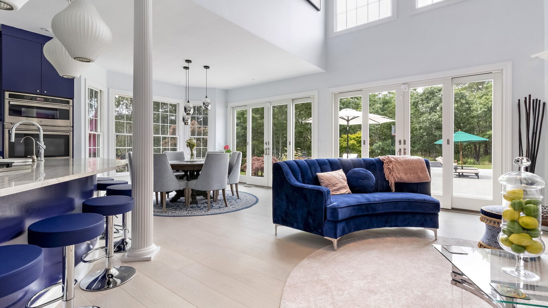 Tucked away on a secluded hilltop in the Hamptons, this post-modern residence on over one-and-a-half acres offers luxurious indoor-outdoor living in East Quogue. Gardens with ornamental trees, evergreens, flowers, and well-manicured landscaping surround the home. The impressive, open 3,800-square-foot interior features grand living spaces with top-of-the-line amenities and furnishings, with an additional 1000-square-foot finished basement. Natural light fills the airy space, illuminating the pristine hardwood flooring and crisp white walls. Relax in the two-story great room with sliding glass doors leading out to the back, plush blue furniture, a cozy fireplace, and a flat-screen TV. Whip up a hearty brunch in the spacious kitchen equipped with stainless steel appliances, granite countertops, and blue cabinetry. Sip a cup of home-brewed coffee made in the Keurig and read the morning paper at the counter area with six bar stools. Share a meal at the casual dining table next to the kitchen or in the formal dining room containing an eight-person table. The office-library is equipped with computer monitor, keyboard and printer, and separate TV for those needing to connect to work. During the evening, the library converts into a 1920s style saloon for entertaining with a connecting bar area, a four-person high table and wine fridge. In the finished basement with hardwood floors, watch a movie or the game in the theatre corner equipped with 85" screens and surround sound, or play a friendly game of pool, ping-pong, and foosball. You can also shoot hoops on the basketball net in the backyard. Work up a sweat before your day begins in the basement fitness area featuring a treadmill, stationary bike, weight training equipment, and a yoga mat to do a self-directed yoga class. In the music corner, strum up a tune with the guitar or keyboard. Play pleasant background music throughout the day using the Sonos speaker system.