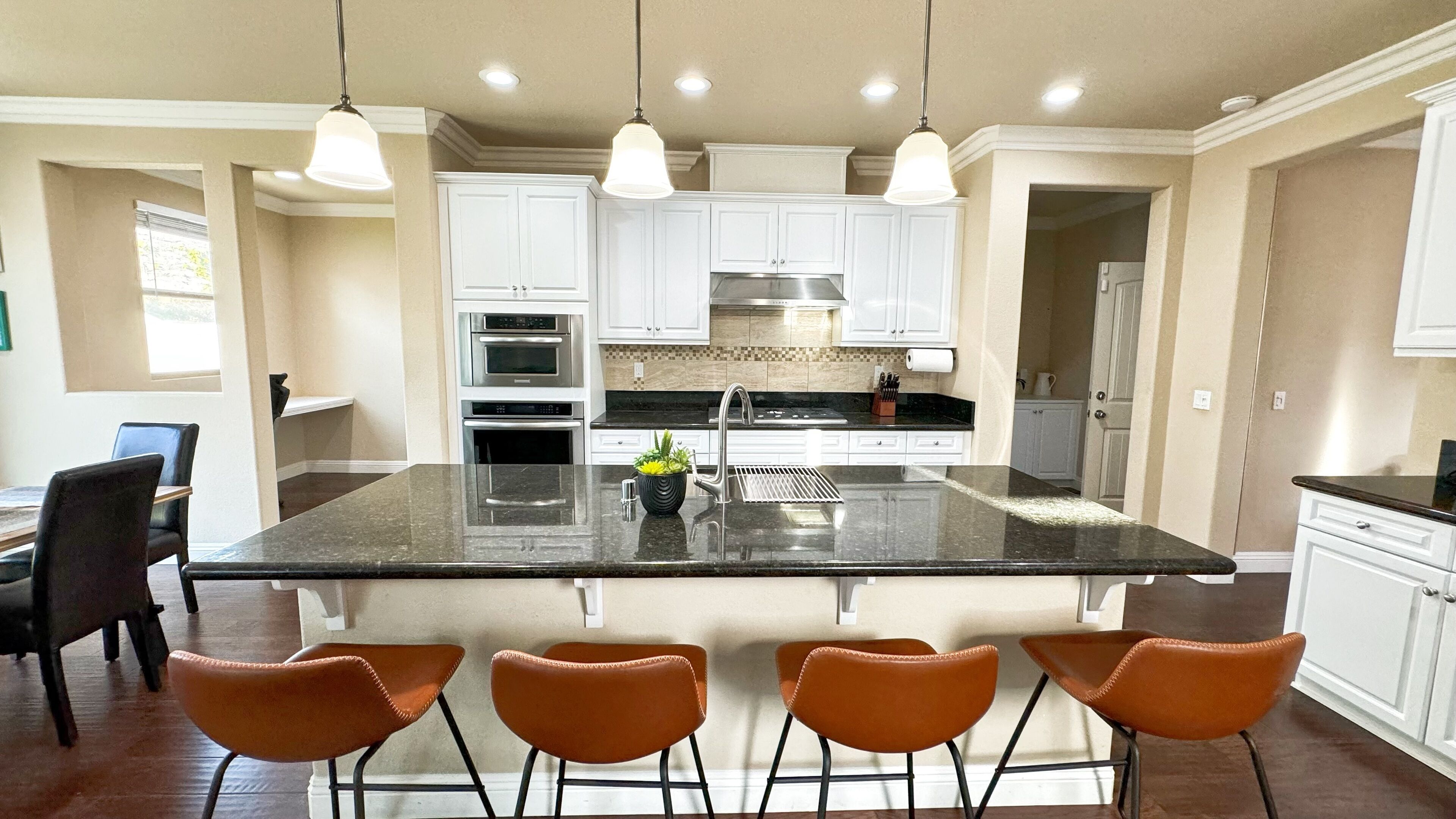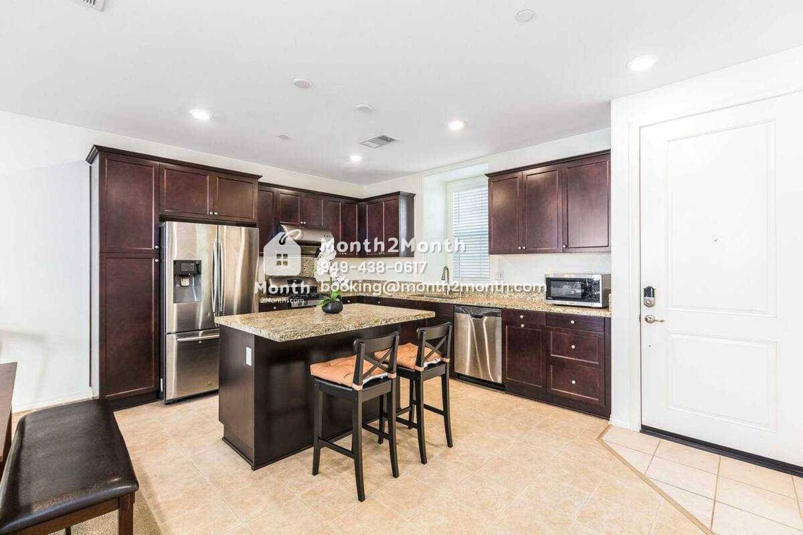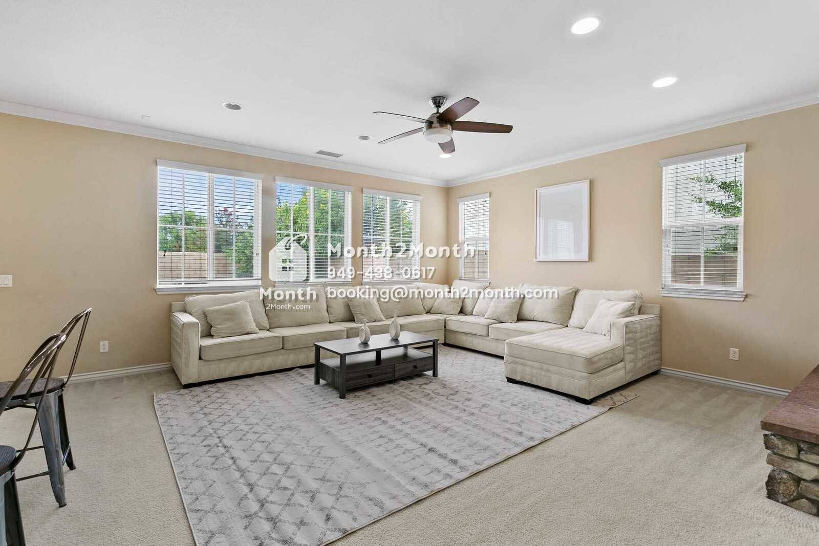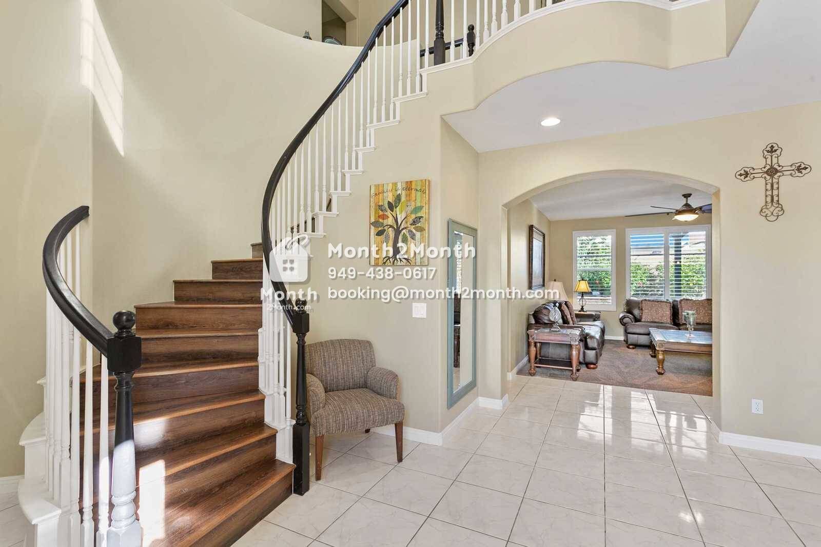 Welcome to Peacock Court Sanctuary, a premier living destination offering a blend of modern luxury and serene comfort. Located in the heart of Eastvale, California, this newly managed property is designed to cater to those seeking quality living spaces for short to medium-term stays, ranging from one to twelve months. Upon entering the Peacock Court Sanctuary, guests are immediately struck by the spacious and elegant layout, which combines contemporary design with homey touches that make the space welcoming and warm. The expansive living area is adorned with plush furnishings, stylish décor, and large windows that bathe the room in natural sunlight, creating a lively yet relaxing environment. The heart of the home, the kitchen, is equipped with state-of-the-art appliances, beautiful quartz countertops, and ample storage space, making it perfect for both quick meals and elaborate dinner preparations. Adjacent to the kitchen is the dining area, where residents can enjoy meals overlooking the beautifully landscaped backyard. Peacock Court Sanctuary offers three luxurious bedrooms, each thoughtfully designed to maximize comfort and privacy. The master suite is a true retreat, featuring a large en-suite bathroom complete with dual sinks, a soaking tub, and a separate shower. Each additional bedroom is equipped with comfortable bedding and ample closet space, ensuring a restful sleep.