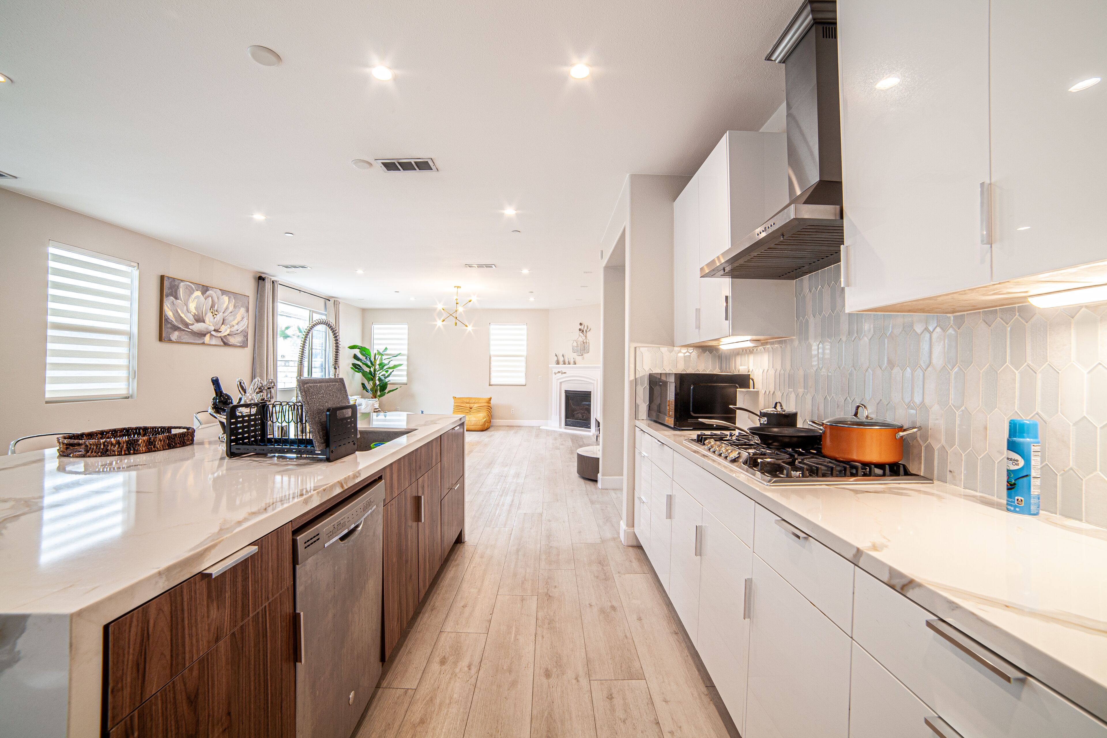 When you first get in to the house, you will first entering into a huge living room perfect for the whole family to hang out and enjoy TV 65''. To the back of the living room is a beautiful kitchen. To the right of the kitchen is dining room with dinning table for 6. Outside the backyard has a grill.