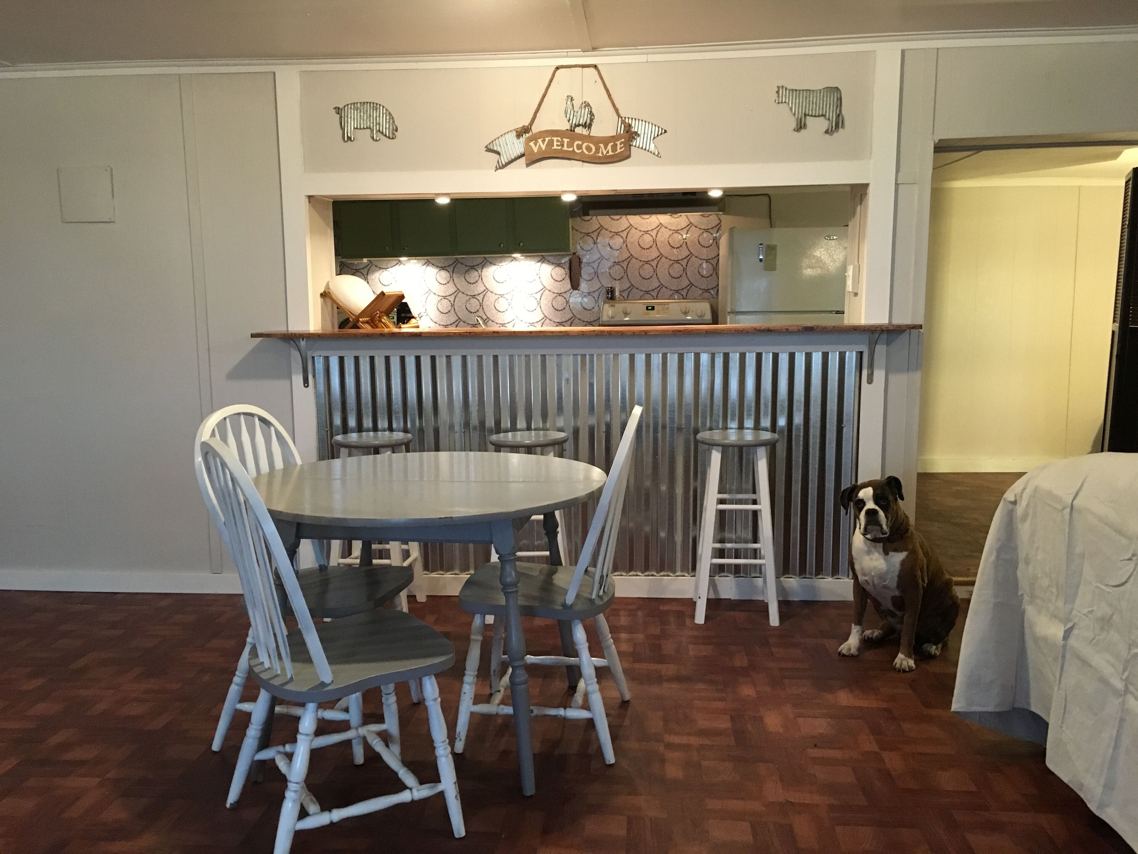 and a 40" smart television that you can use with your own Netflix, Hulu, or other accounts. The open concept kitchen has matte stainless refrigerator, dishwasher, stove, and microwave and quartz countertops. We provide a coffee maker and a small supply of ground coffee, filters, and sweeteners. The kitchen is fully stocked with basic cooking supplies, blender, griddle, mixer, toaster, and 12 settings of dinnerware and glasses. There is seating for two at the bar, and a picnic table on the patio.