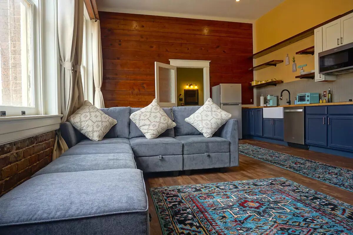 Brick & Leather is a beautiful mixture of Historic Palestine and the remodeled comforts of today. The original brick walls complimented by the height of the 12' ceilings make this an unforgettable stay