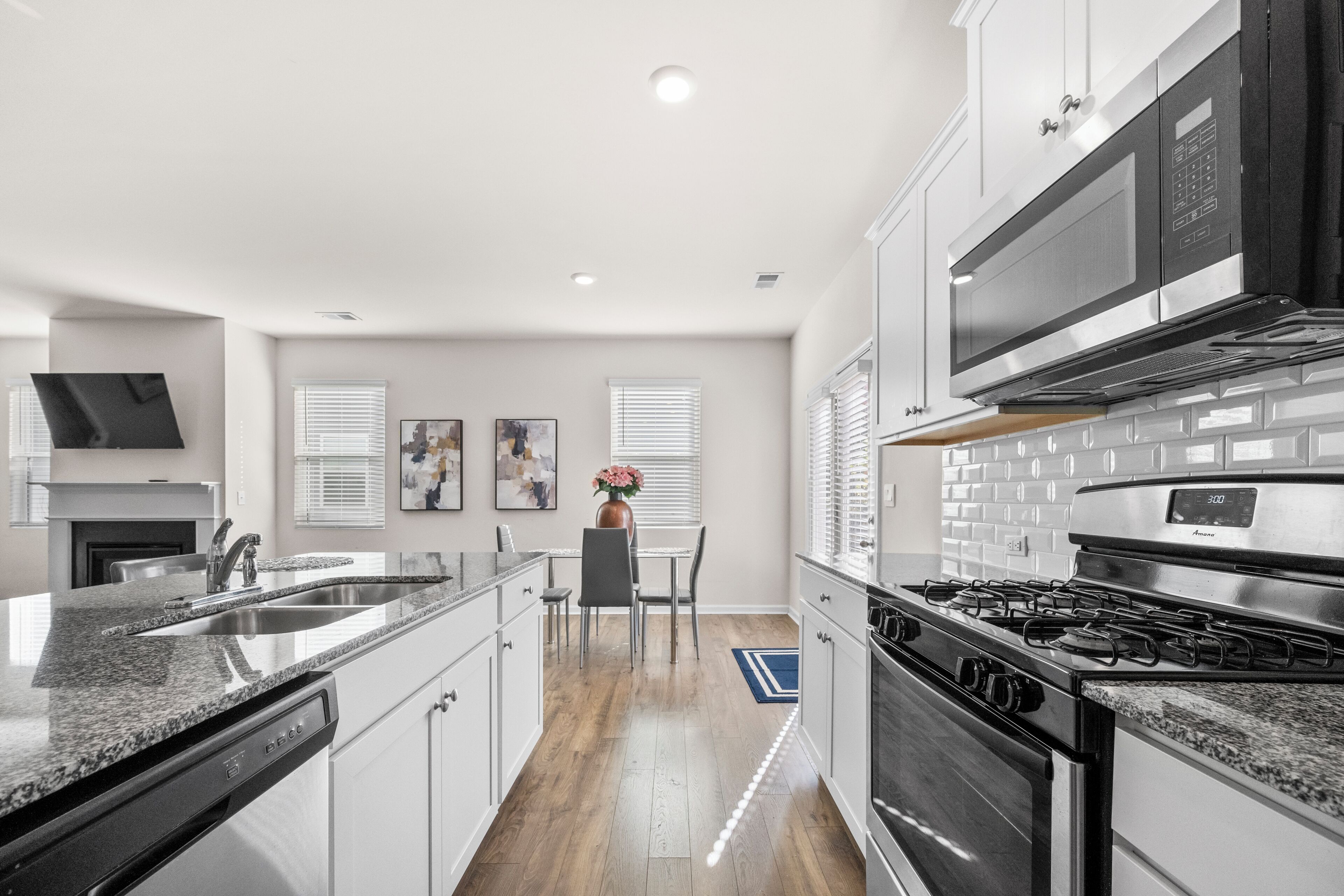 The main floor features a bright, fully stocked kitchen and a cozy living area with a sectional, fireplace, and smart TV. Enjoy meals in the dining area for four, complete with a convenient coffee bar that includes a Keurig, Nespresso, and electric kettle. A half bath and access to the fenced backyard—equipped with a grill, tabletop fire pit, and seating for four—round out the space.